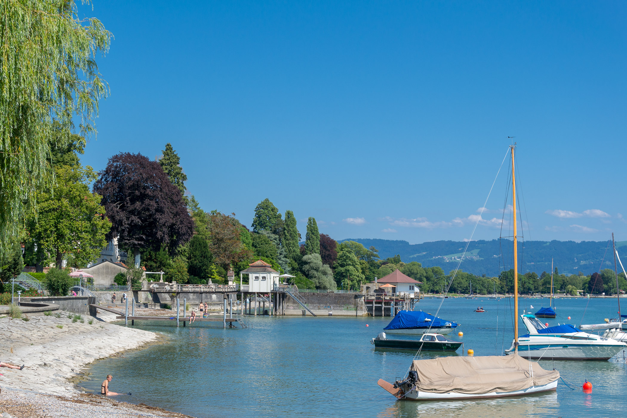 Auch an unserem Ankunftstag zeigte das Thermometer mehr als 30°C an. Doch wir wollten noch etwas sehen. So erkundeten wir Wasserburg. Erst spazierten wir zum Bahnhof, dort in der Nähe ist ein Nahkauf (Edeka), in dem wir uns Wasser kauften. Danach noch ein Eis in der Gelateria in der Innenstadt bevor wir den Einkauf zum Hotel brachten. Dann mussten wir aber auch endlich zum Bodensee. Der kurze Weg stellte kein Hindernis dar. Auf der einen Seite war ein kleiner Spielplatz, leider darf man hier aber nicht ins Wasser. Wir schauten uns dann noch den Hafen Wasserburgs an bevor wir am Bodensee zurück zum Hotel liefen.