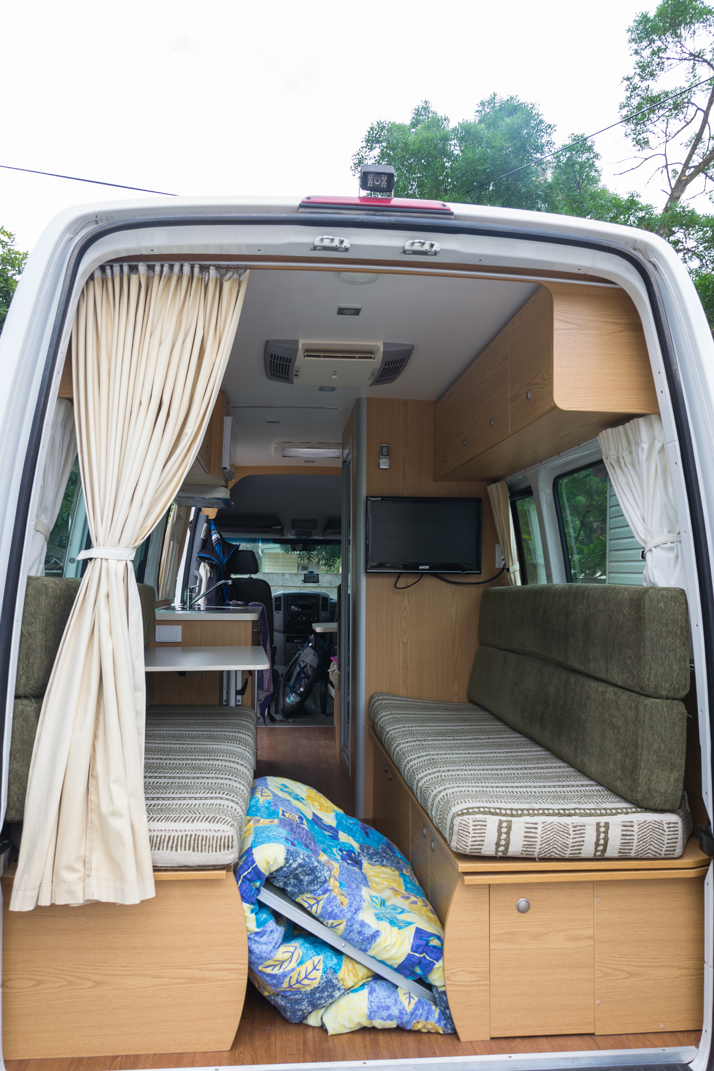 Die Einweisung war kurz und wir dachten, wir hatten alles verstanden. Leider wurde vergessen uns zu erklären wie wir Frischwasser auffüllen können. Dafür wussten wir wie die Chemietoilette funktioniert und wie wir das Bett machen können. Also erst einmal einsteigen und losfahren. Nach dem ersten Einkaufen blinkte dann eine Warnleuchte auf, eine Lampe sei defekt. Wir fuhren dann noch einmal zurück und klärten das, bei den VW Apollo Euro Tourern gibt es einen Wackelkontakt und dann wird angezeigt eine Lampe sei defekt, obwohl das gar nicht so ist.