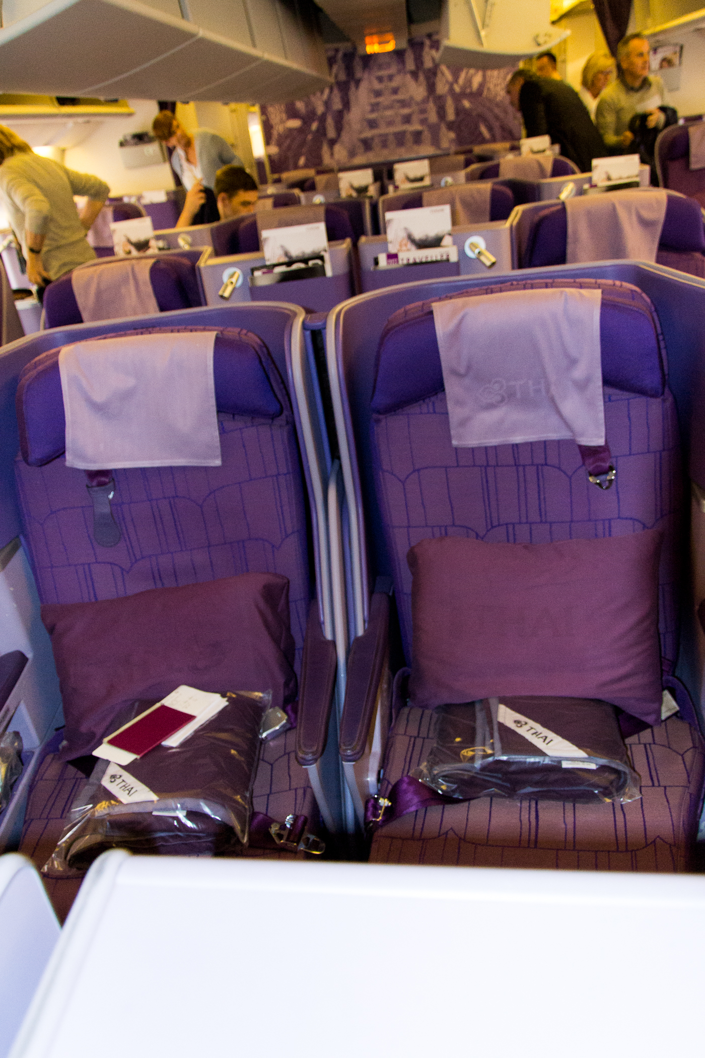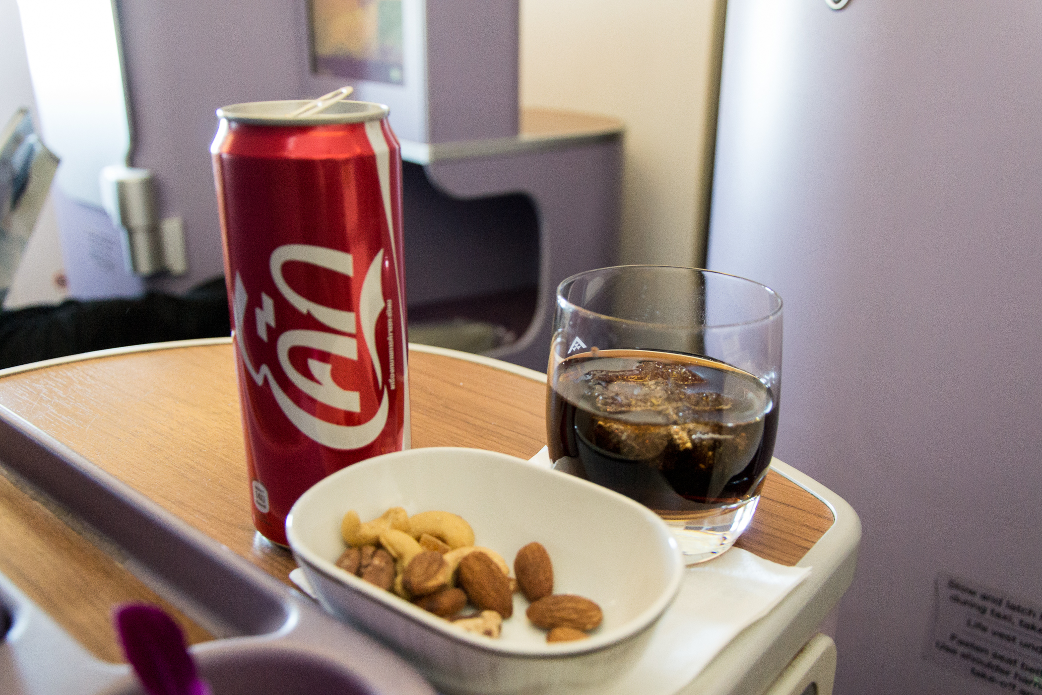 Das war der bislang längste meiner Flüge. Durch den Miles and More Award hatten wir für den Flug nach Sydney Royal Silk, also Business Class Plätze bei Thai Airways in der Boing 777-300ER. Der Platz war sehr persönlich und wir fühlten uns gleich wohl. Wir hatten genug Platz für unsere Beine und konnten auch bequem sitzen. Unser Gepäck musste nur über einem anderen Sitz verstaut werden. Vor dem Start gab es dann schon eine kleine Erfrischung, einmal Wasser für die Dame und Cola für den Herrn. Wir hätten aber auch Champagner trinken können.