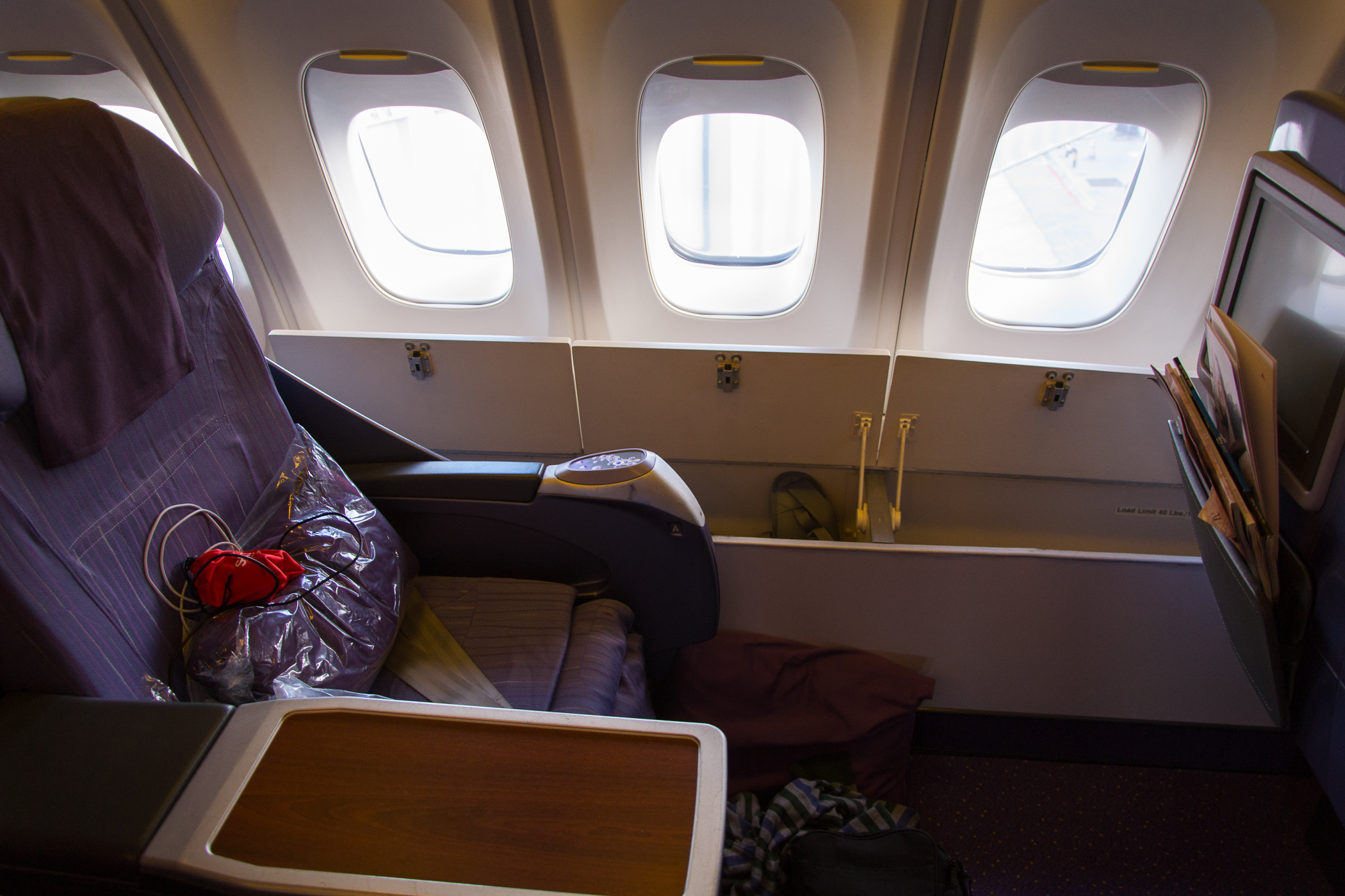 Der Thai Airways Flug nach Sydney startete verspätet. Auch das Einsteigen startete verspätet. Die Traube vor dem Eingang stellte ich mir auch genauso vor. Business Class durfte aber zuerst einsteigen und so drängelten wir uns unter den bösen Blicken der anderen Fluggäste vorbei und stiegen ein. Es ging nun mit einer Boing 747 von Thai Airways nach Sydney. Wir hatten Plätze in dem oberen Teil der Royal Silk genannten Business Class. Hier gibt es auch die „Rutsche“. Der Sitz sieht nach mehr Platz aus, dafür gibt es nicht dieses mein Platz, mein Haus Gefühl, da man sich hier doch mehr beobachtet fühlte.