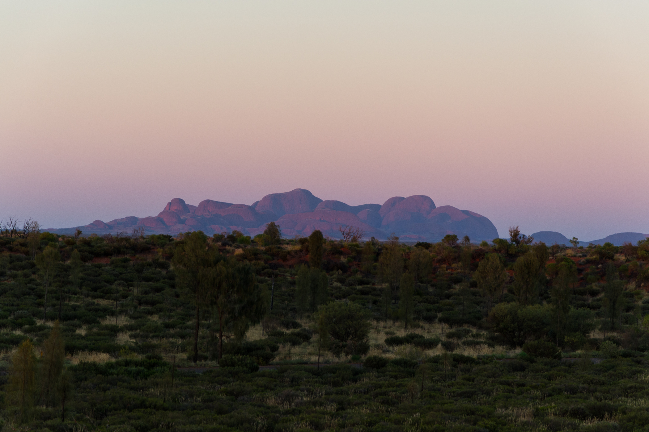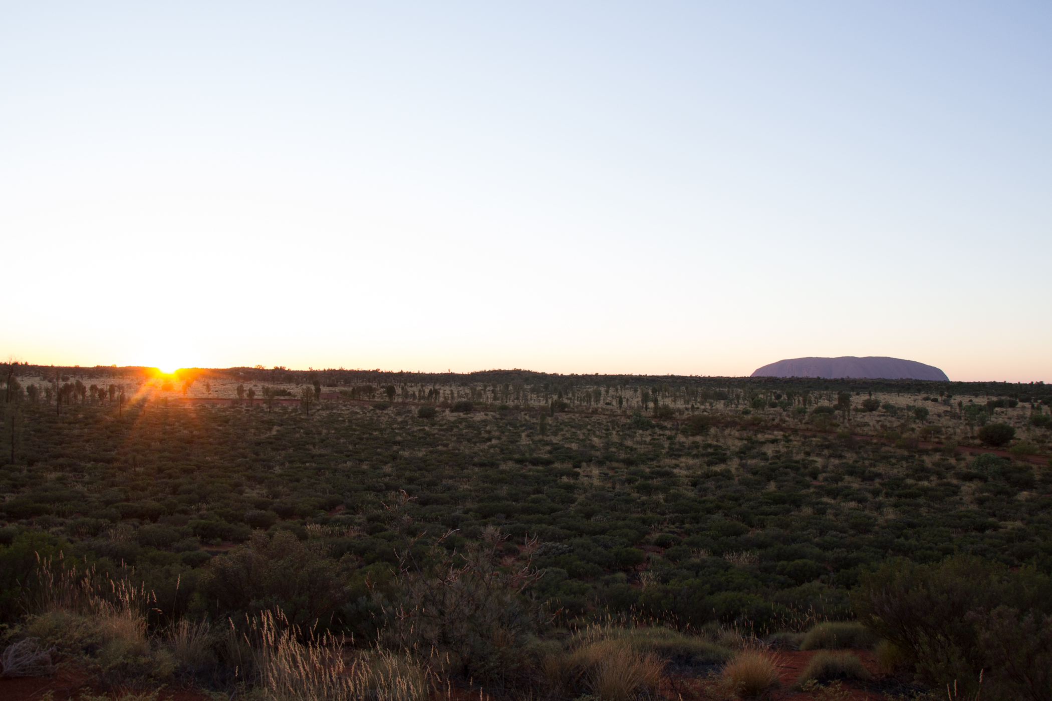 Bevor es zum Kata Tjuta ging, fuhren wir mit dem Bus nach dem Frühstück auf eine kleine Anhöhe bei unserem Resort. Während die Sonne aufging, beobachten wir den Uluru und die Sonne links daneben. Einmal umdrehen und der Kata Tjuta war direkt auch zu sehen. Ein wunderschöner Anblick gleich am Morgen.