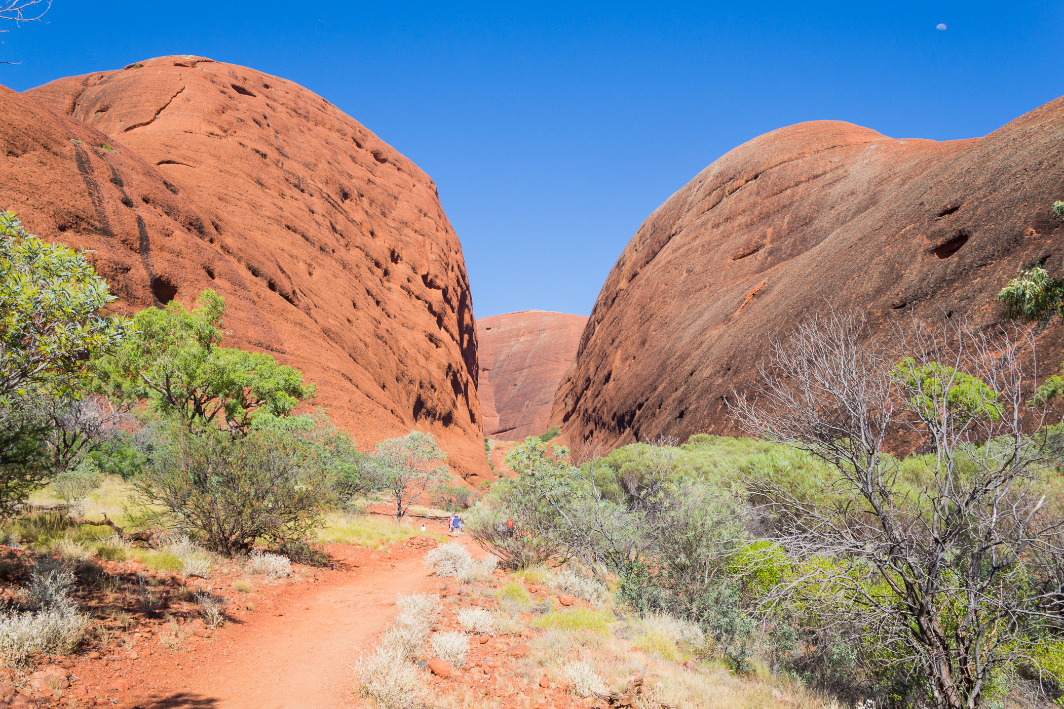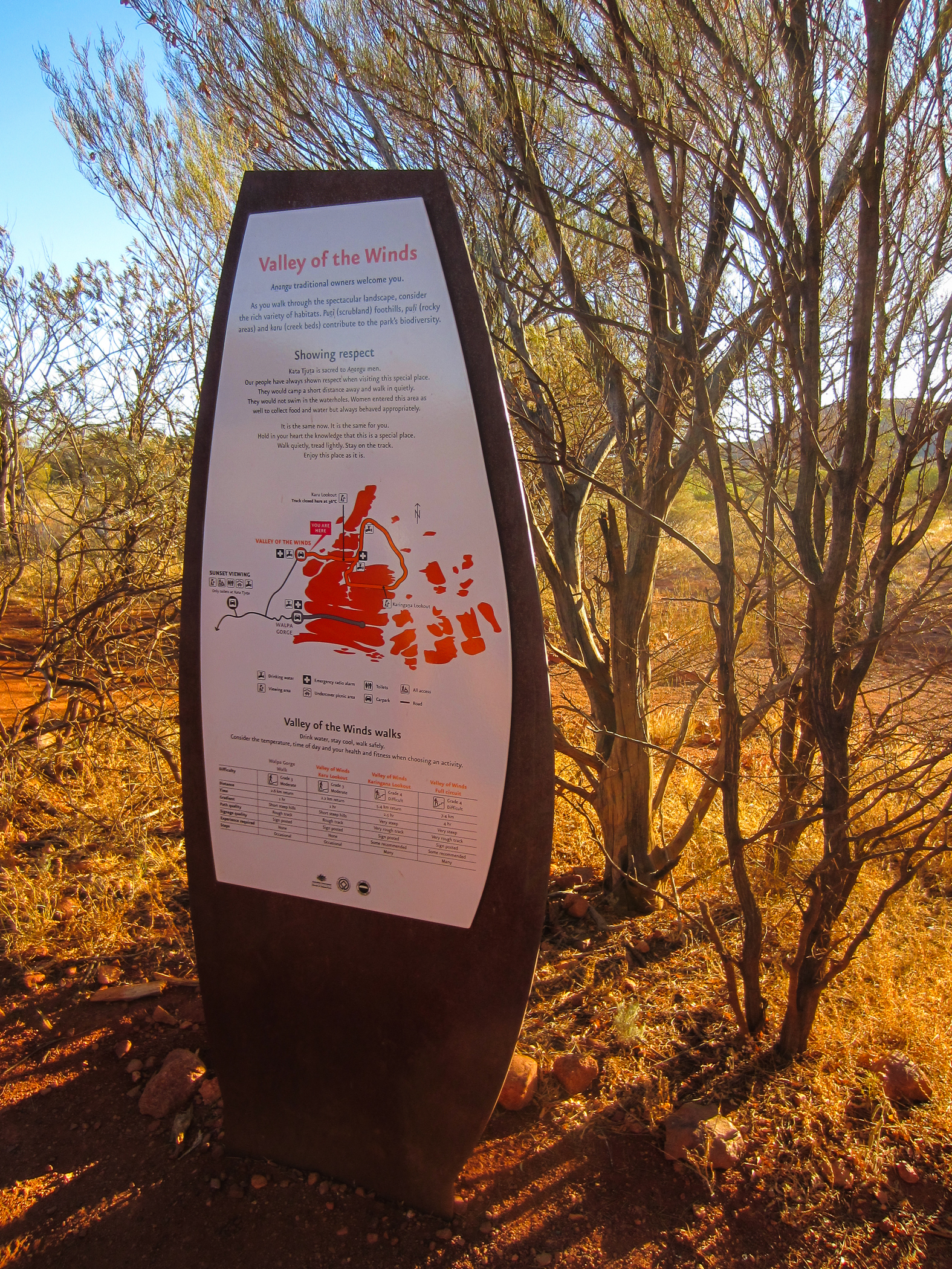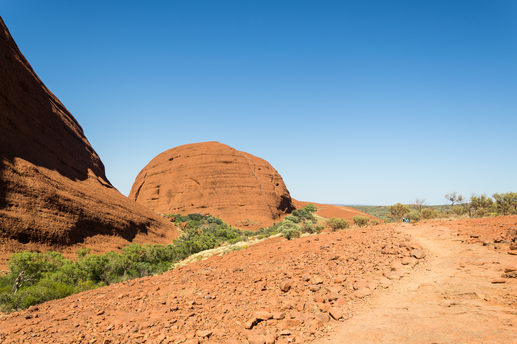 Am Kata Tjuta sind nicht alle Wege direkt als Wege zu erkennen. Dafür findest du alle paar Kilometer frisches Wasser zum Trinken. Unser Bus stand also auf dem Parkplatz und wir machten uns auf. Während Hayden, unser Guide von Wayoutback, einiges erklärte wanderten wir das erste Stück bis zum Aussichtspunkt. Bis hierhin war der Weg am Kata Tjuta noch schön eben und gleichmäßig.