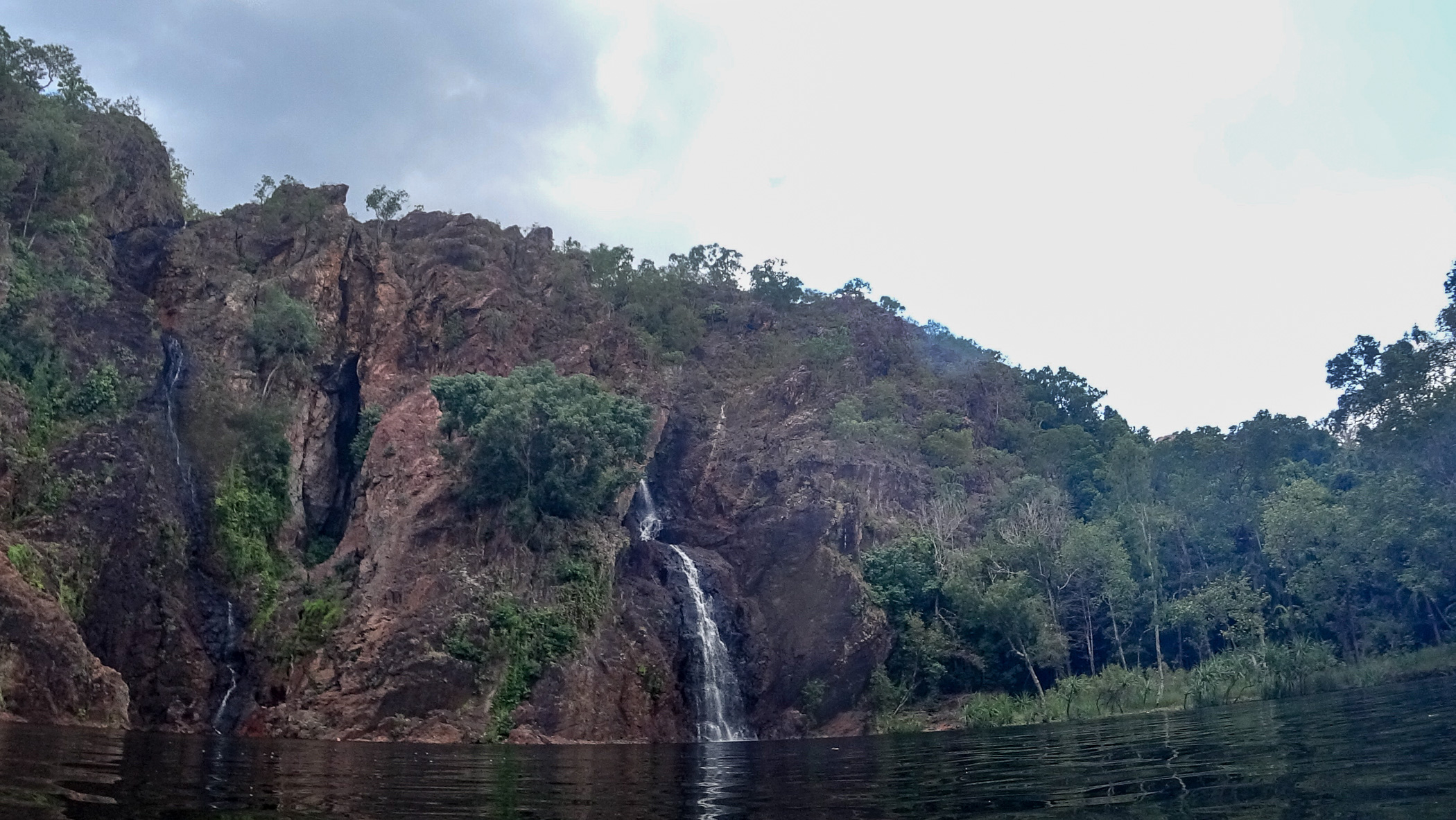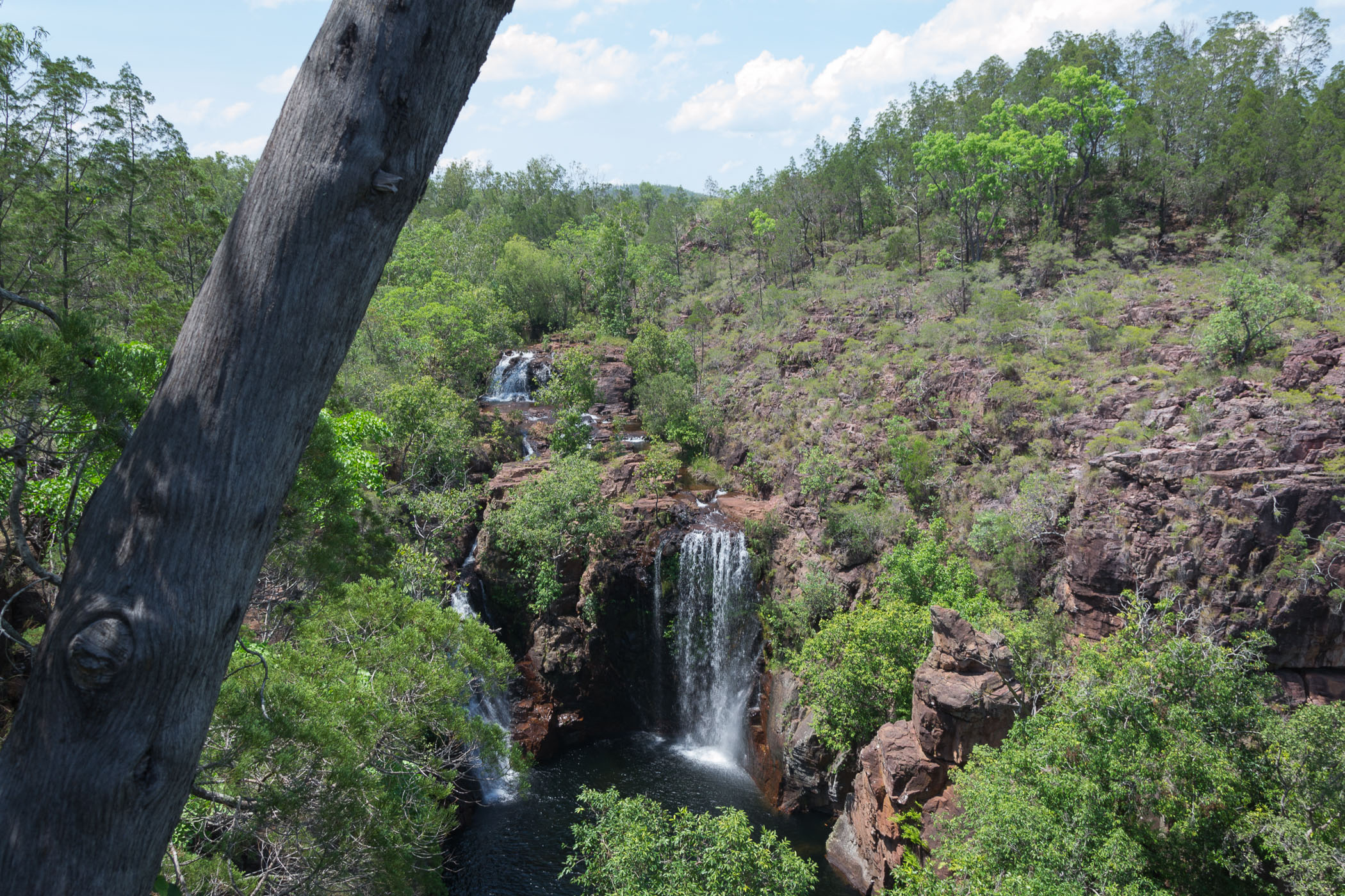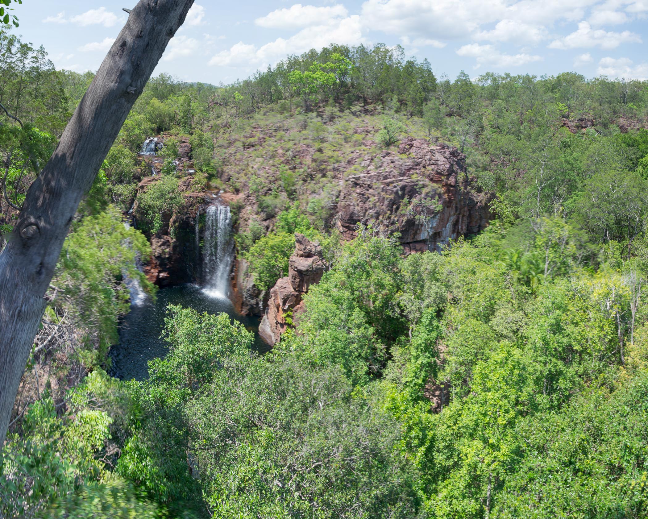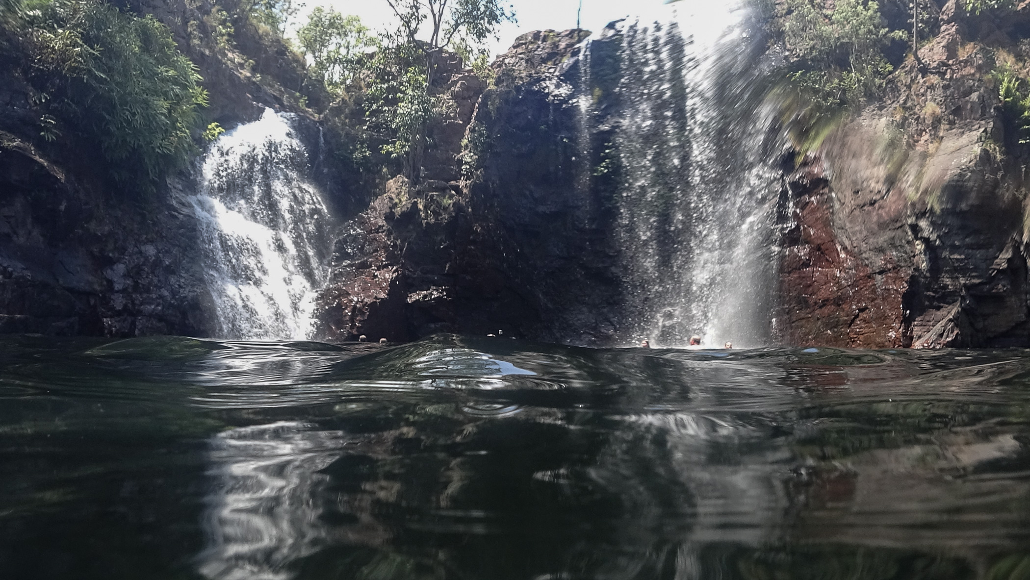 Am Florence Falls angekommen sahen wir gleich die ersten Fische aber keine Krokodile, Glück gehabt. Das hielt uns aber nicht davon ab ins Wasser zu gehen. Hier schwamm ich bis zum Wasserfall durch. Es war aber nur ein kleiner Bereich zum Stehen und das Atmen fiel trotzdem etwas schwer wegen dem ganzen Wasser. Nach einem Gruppenfoto stärkten wir uns dann noch bei Orangen, die unser Guide bereitstellte.