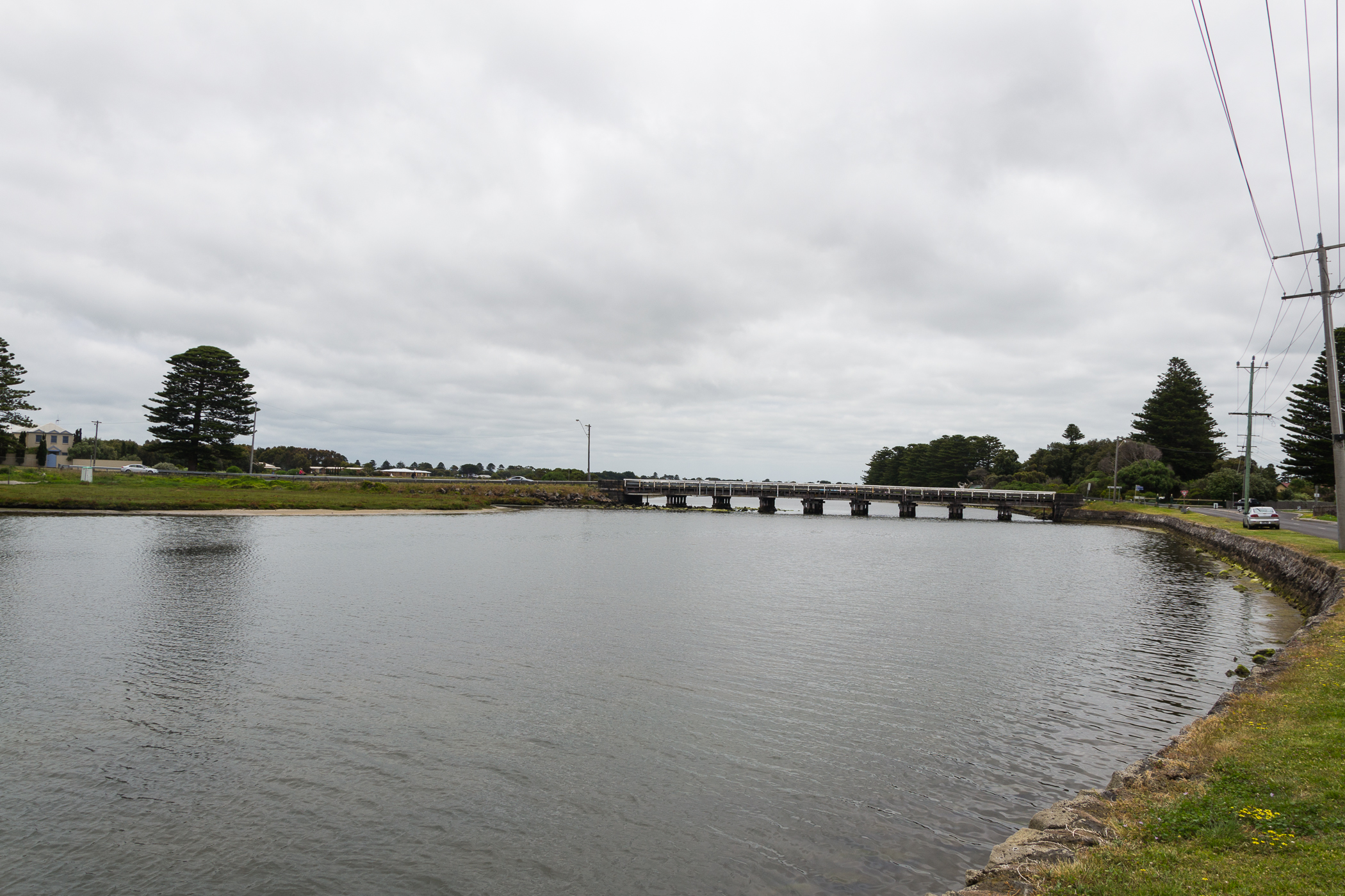 Hier in Port Fairy gibt es noch ein paar Hotels, Pubs und Restaurants. Die Tourist Information ist direkt in der Innenstadt gelegen. Obwohl sie auch sonntags geöffnet hat, informierten wir uns nur auf dem Stadtplan, wo wir unsere zwei Stunden in Port Fairy verbringen möchten. Zuerst liefen wir dann zum Weststrand. An einem kleinen Abschnitt darf man hier schwimmen. Doch mit 16°C Lufttemperatur war mir das ganz etwas zu kalt. Zurück kamen wir über eine Fußgängerbücke an einer Informationstafel zum Hochwasser in Port Fairy vorbei. Sehr Interessant wie hoch das Wasser beim Jahrtausend Hochwasser stand und wie hoch es normal steigt.
