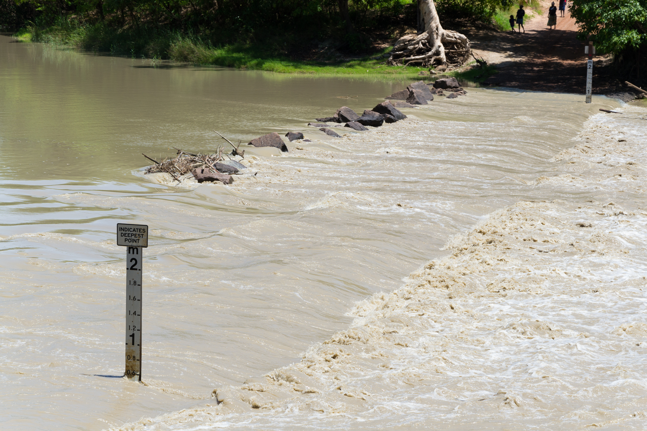 Doch ich wollte gerade über den ersten Stopp erzählen. Durch die Wet Season ändern sich die Gegebenheiten im Kakadu National Park immer wieder. Zufällig fand gerade das Crocodiles Massacre statt. Da töten sich aber keine Krokodile gegenseitig, sondern diese fressen sich an den Fischen satt, die sich in dem, durch Regen entstandenen, temporären Fluss befinden. Durch den Fluss ist auch eine Straße unterbrochen. Doch das stört uns nicht, hier sahen wir jetzt das erste Mal wilde Krokodile.