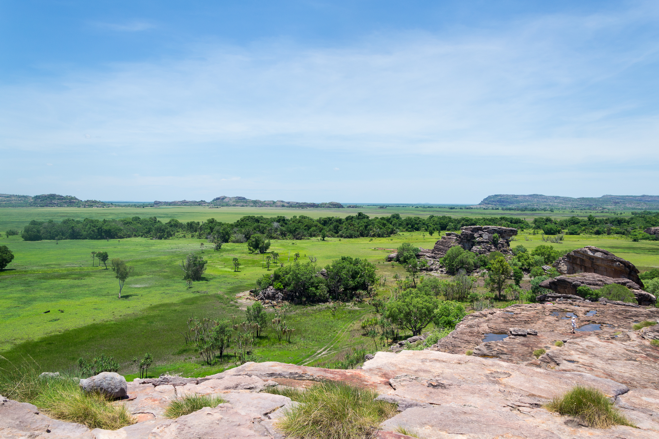 In der Mitte des Rundweges wartete noch eine kleine Klettereinlage auf uns. Doch die Aussicht war es wert sich in der Hitze den Berg hoch zu schleppen. Wir konnten über grüne Wiesen weit hinaus schauen. Da lohnt es sich auch in der Wet Season die Top End Tour zu machen. Danach hatten wir dann einen kleinen Mittagsnack. Da es heiß war benötigte ich auch nicht mehr. Wir hatten Sandwiches, die wir uns selbst belegten.