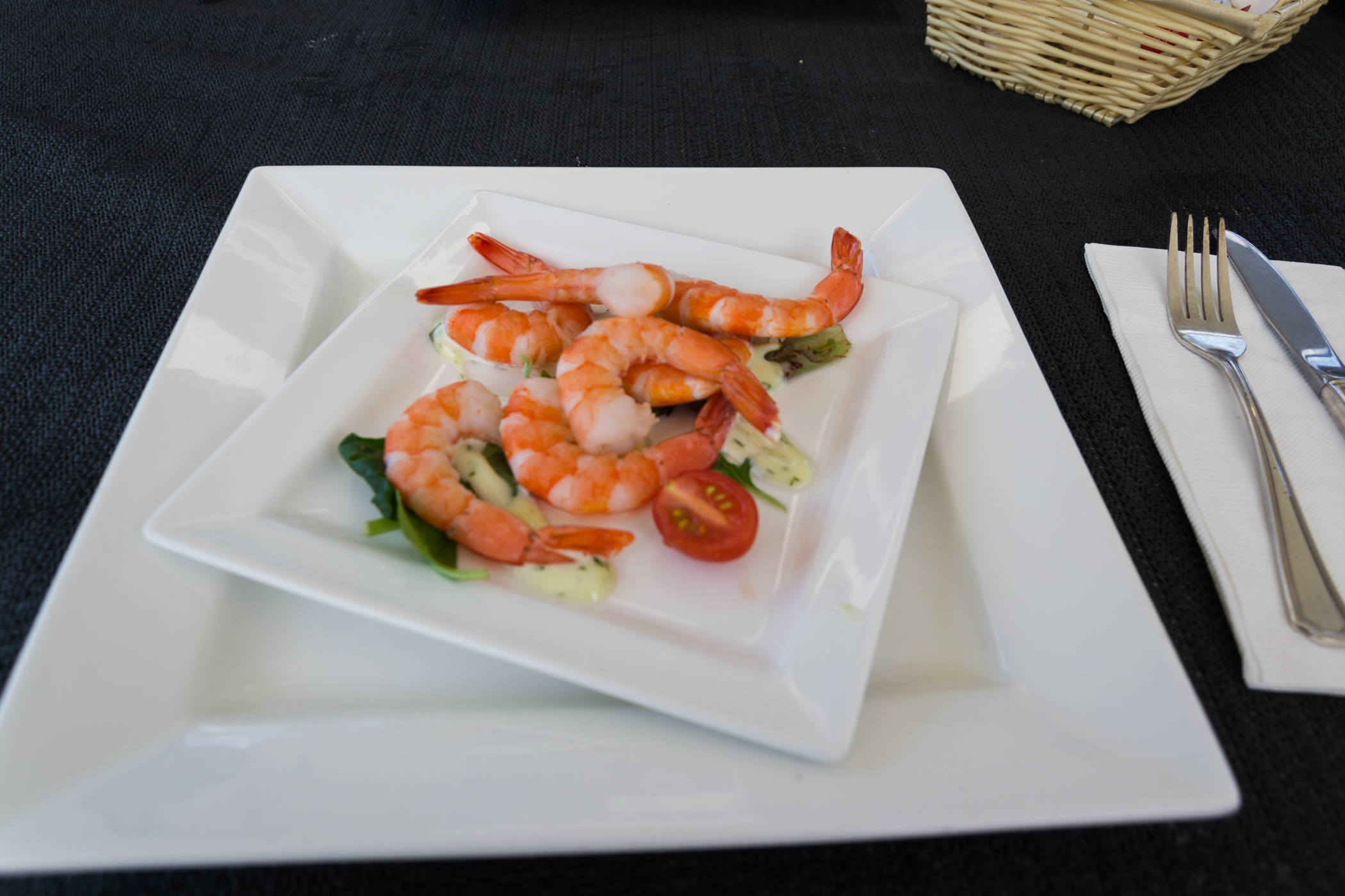 Danach gab es dann auch schon Essen. Daher auch der Name Sydney Luncheon Cruise. Wie sich während dem Essen herausstellte, waren auch vier andere Gäste in ihren Flitterwochen. Beide hatten am 19.11. geheiratet und sind dann gleich losgeflogen. Zuerst gabe es Garnelen, danach Lachs und Steak mit Kartoffelsalat. Für die Vegetarier gab es Tomate Mozzarella anschließend eine Quiche. Während der ganzen Sydney Luncheon Cruise konnten wir so viel Wein, Bier, Wasser und Cola trinken, wie wir wollten.