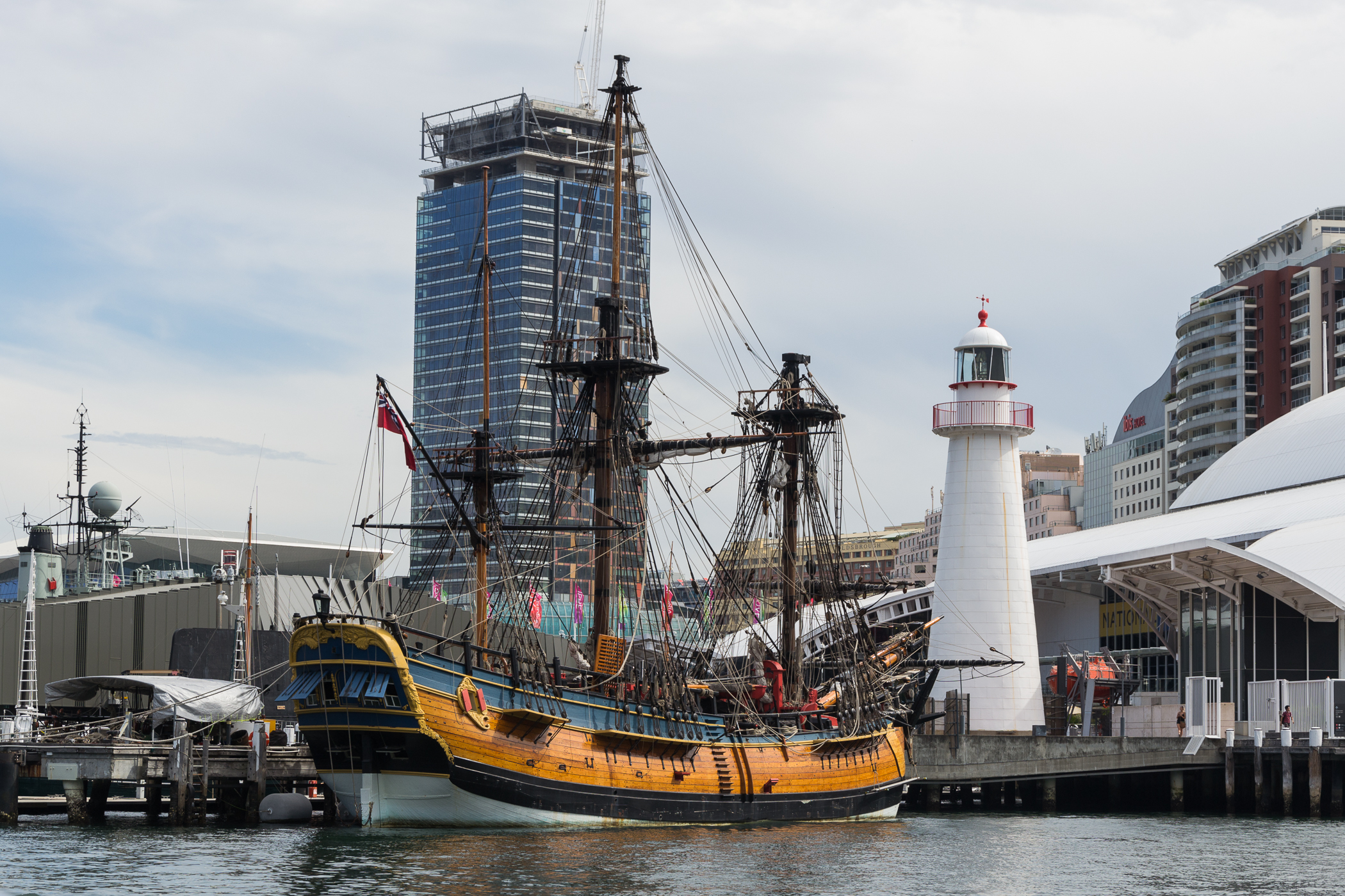 Das Essen war super, und die Sonne schien weiter. Doch langsam zogen Wolken auf. Wohl, weil die Sydney Luncheon Tour sich dem Ende näherte. Nach vier Stunden war die Tour um 16:30 Uhr zu Ende. Doch vorher fuhren wir noch unter der Harbour Bridge durch nach Darling Harbour. Dann natürlich auch wieder zurück, denn die Anlegestelle liegt direkt neben dem Oversea Terminal der Kreuzfahrtschiffe, an dem immer noch das große Schiff lag.