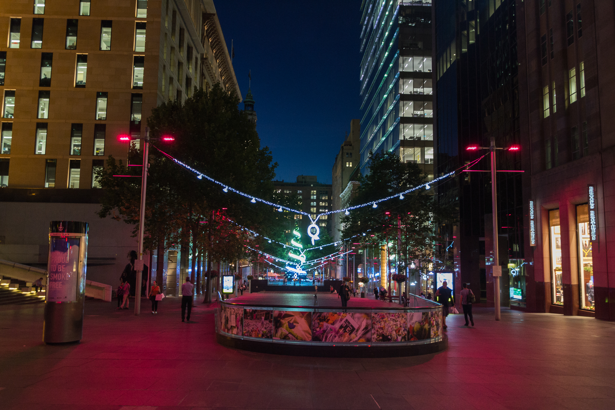 So entschieden wir uns für ein anderes Lokal, Mediterran, an der Waterfront. Mit Blick auf Sydney und das Wasser aßen wir zu Abend. Und dazu war es auch wirklich angenehm warm. Zurück fuhren wir dann auch nicht mit der Bahn, sondern liefen durch Sydney zurück. Es wurde langsam dunkel und die Weihnachtsbeleuchtung in den Straßen wurde eingeschaltet. Wir haben einige Weihnachtsbäume gesehen. Heute hatten die Geschäfte auch bis 21 Uhr auf.