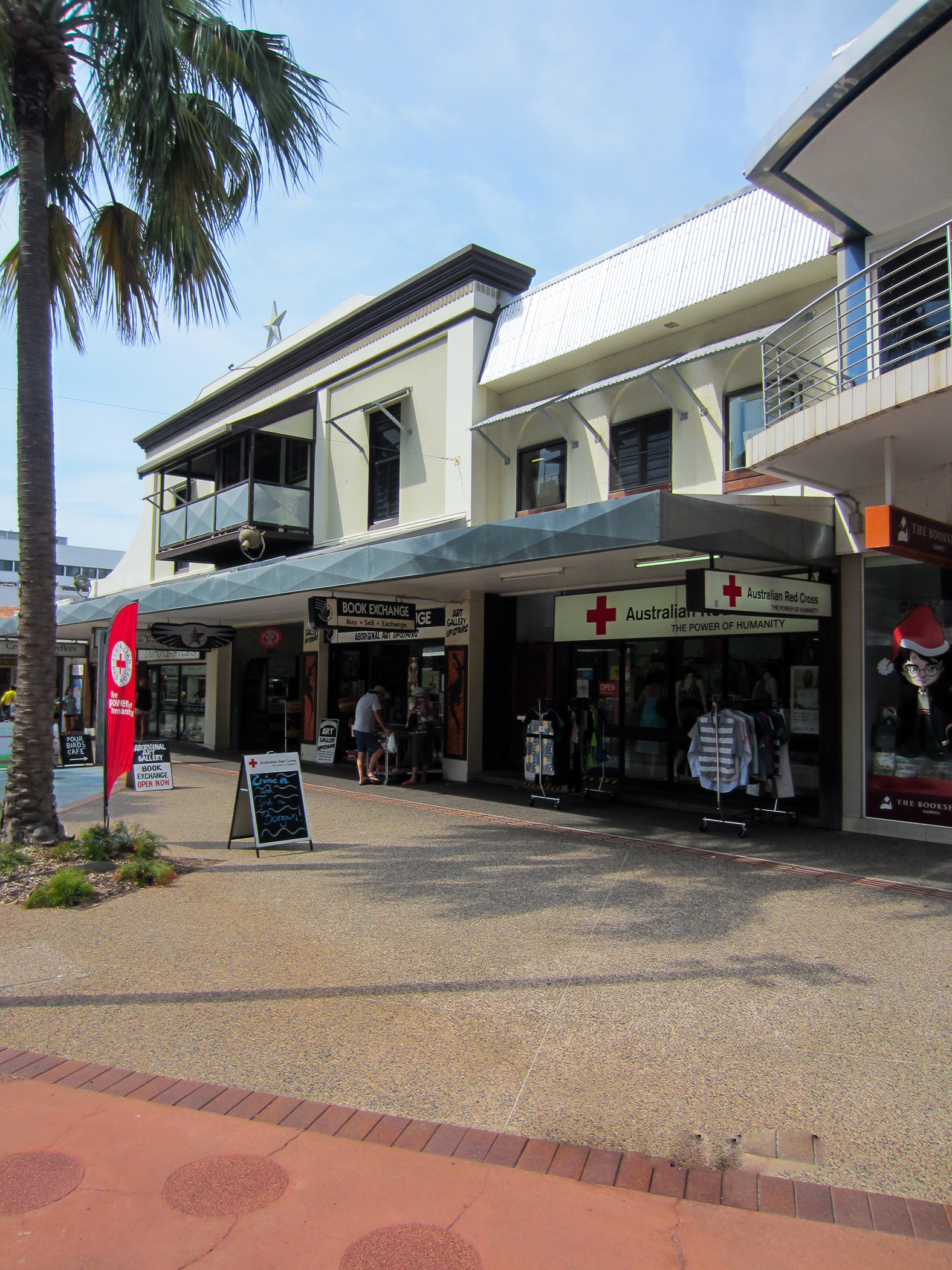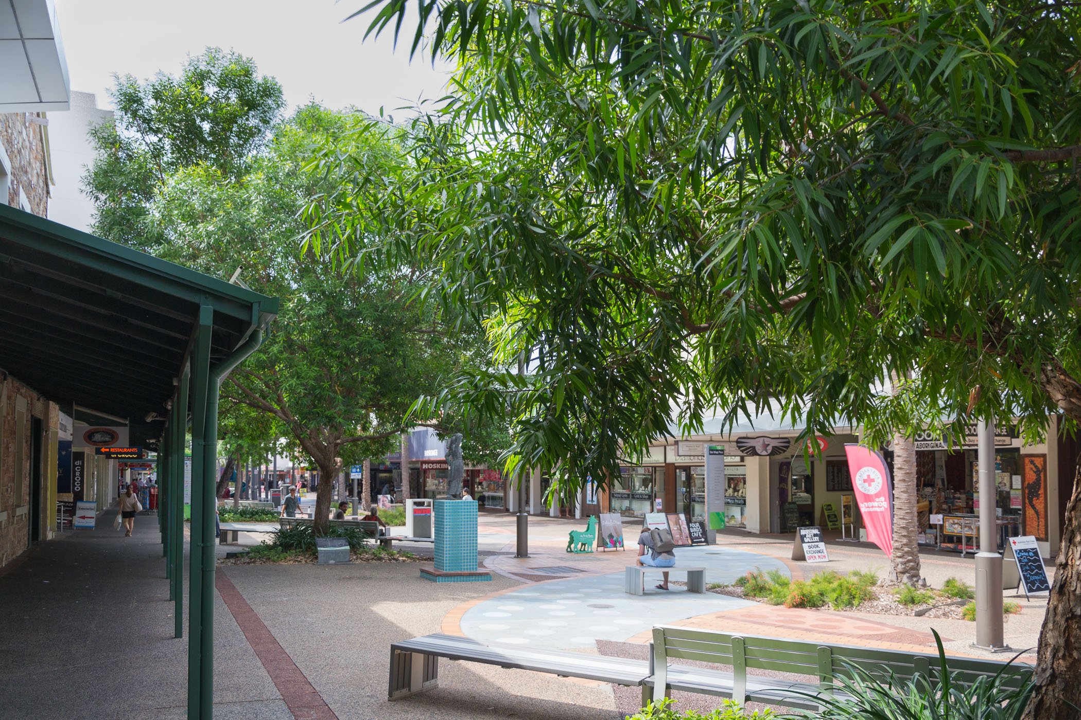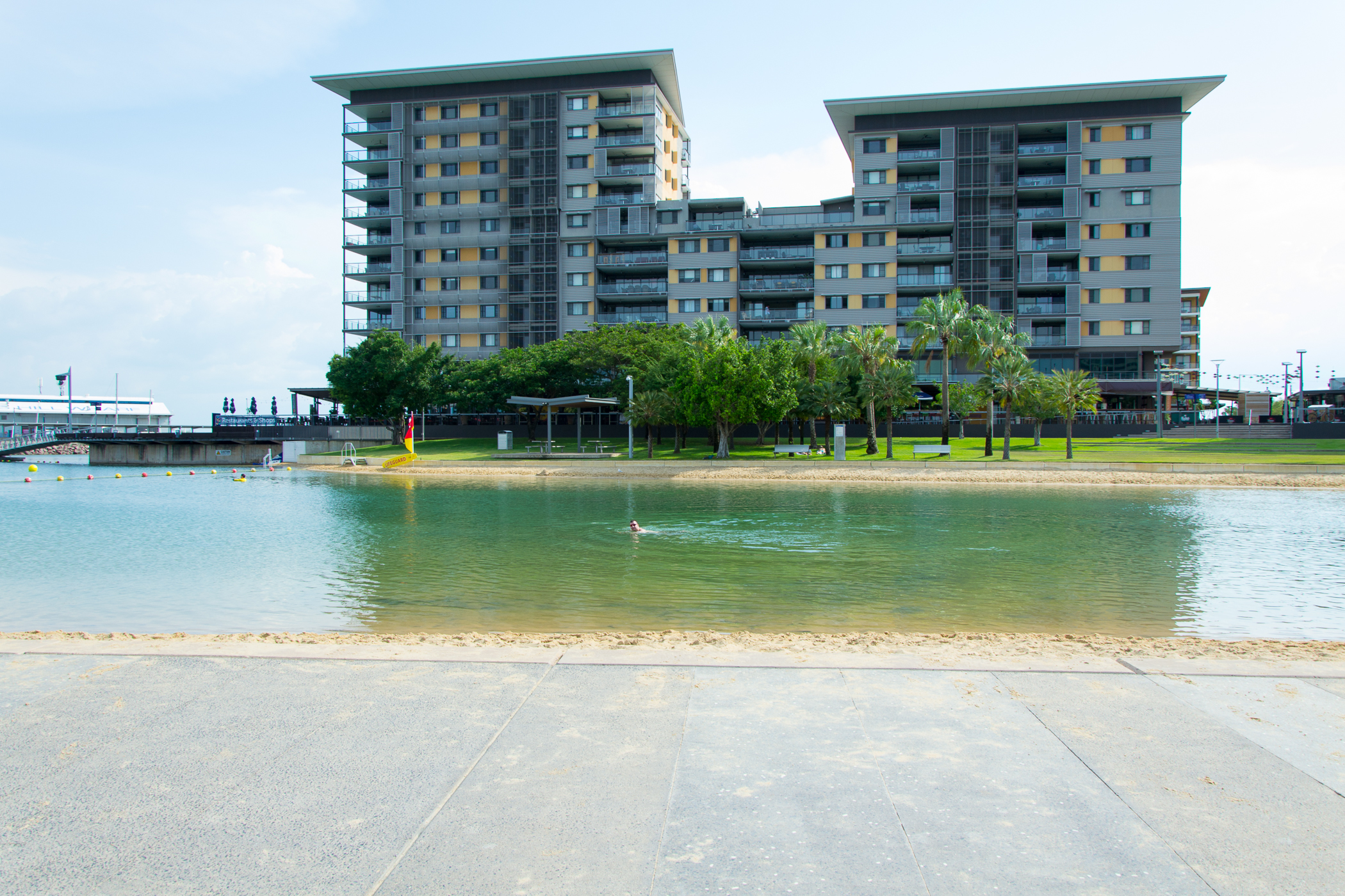 Kurz noch frisch machen, dann erkunden wir etwas die Umgebung in Darwin. Zu Fuß spazierten wir durch den Bereich um das Hotel. Durch die kleine Fußgängerzone The Mall bis zum Meer. The Mall ist keine richtige Mall sondern eine Straße in Darwin mit einigen Geschäften. In der Innenstadt Darwins ist nicht viel los. Entweder sind alle arbeiten und in der Schule oder das angekündigte Gewitter hält viele Zuhause. Auch am Strand bei Darwin Waterfront gibt es genug Freiraum. Also kurz mal das T-Shirt ausziehen und dann geht es ins Wasser. Ich stellte mich auf kaltes Wasser ein, doch hier hat das Wasser Badewannentemperatur. Das war so warm. Da konnte ich nicht widerstehen und schwamm etwas.