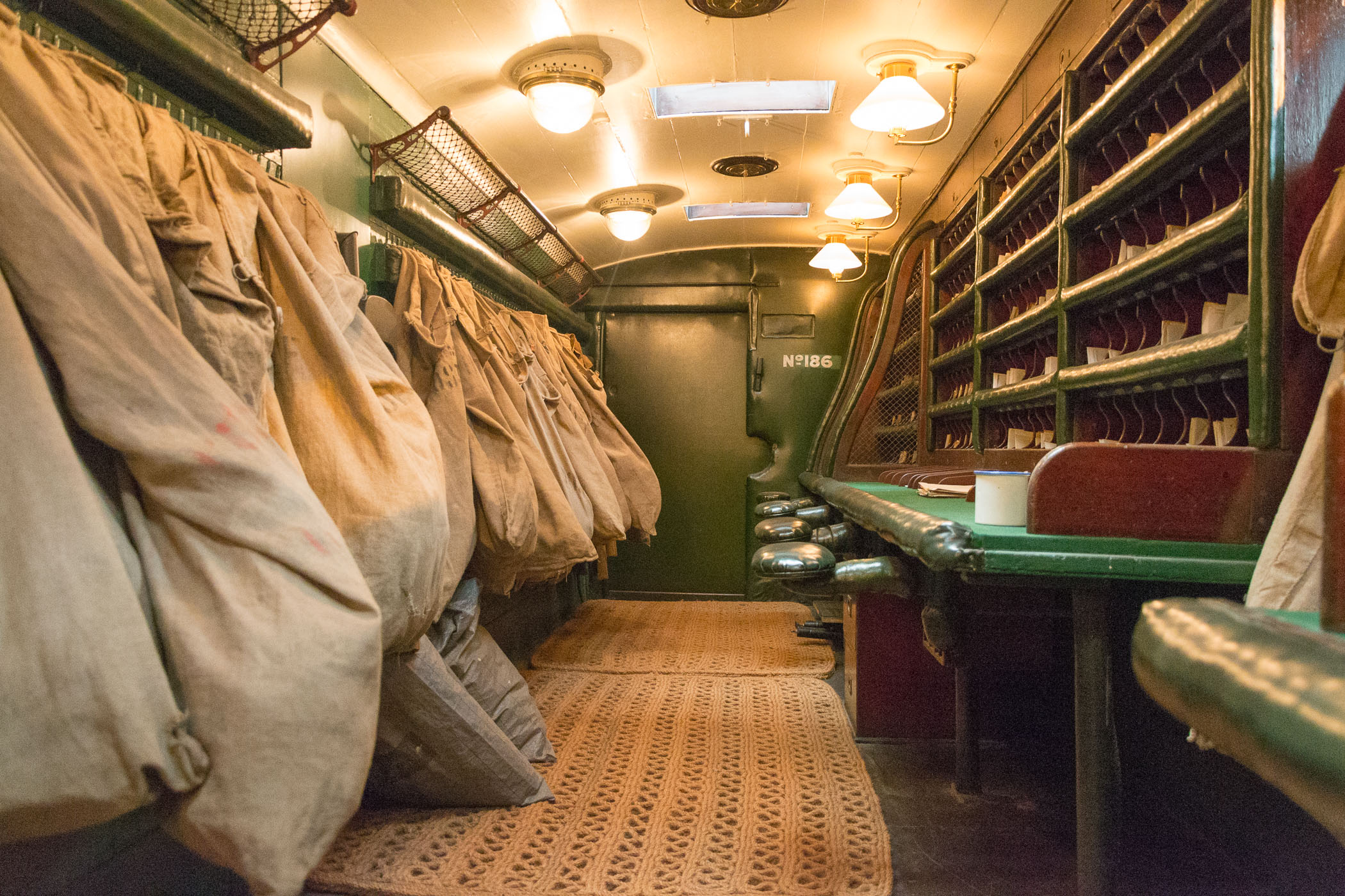 - Britischer Postzug – Innenansicht mit Postsortieranlage und Postsäcken