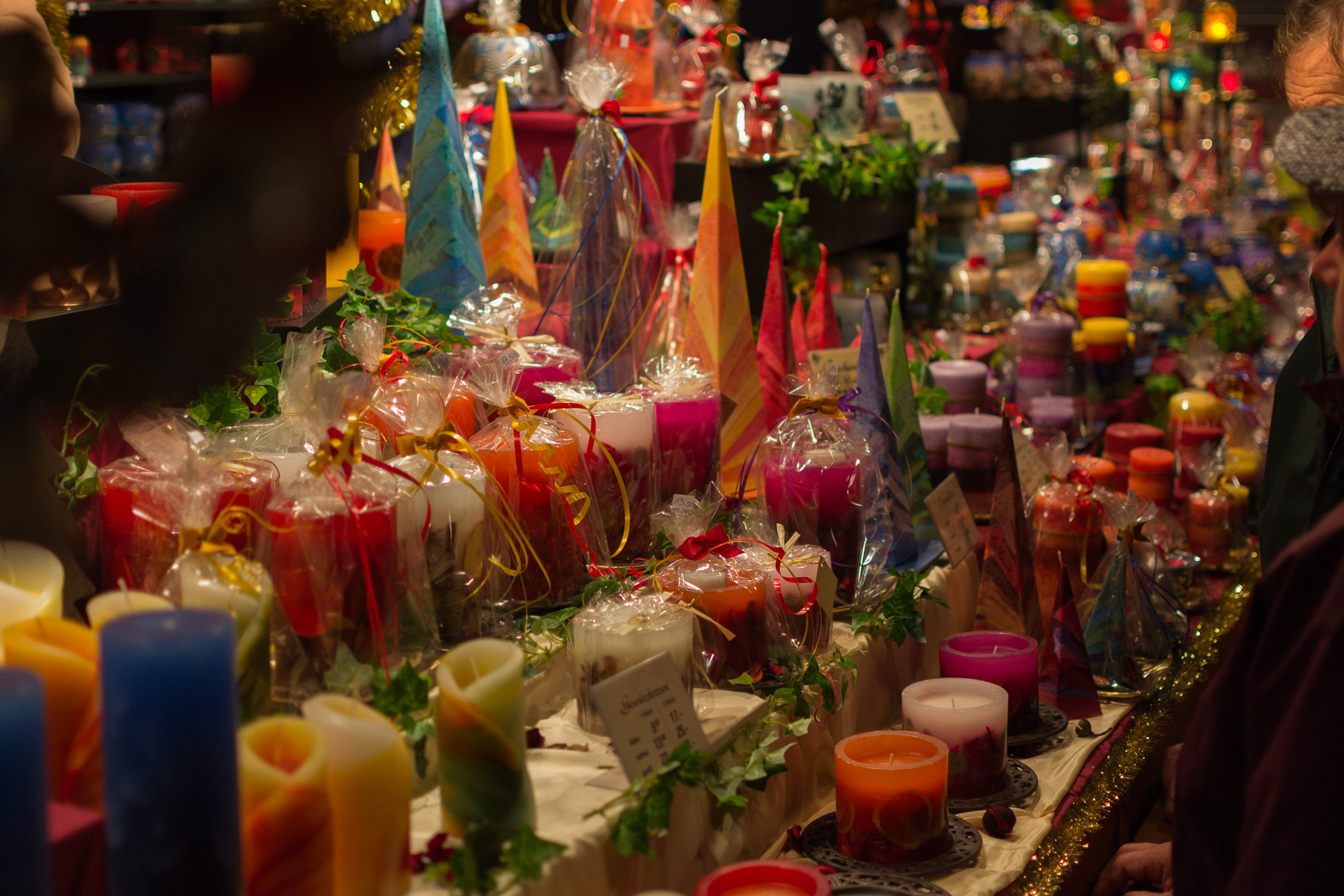 - Kerzen in allen Farben und Formen auf dem Christkindlesmarkt