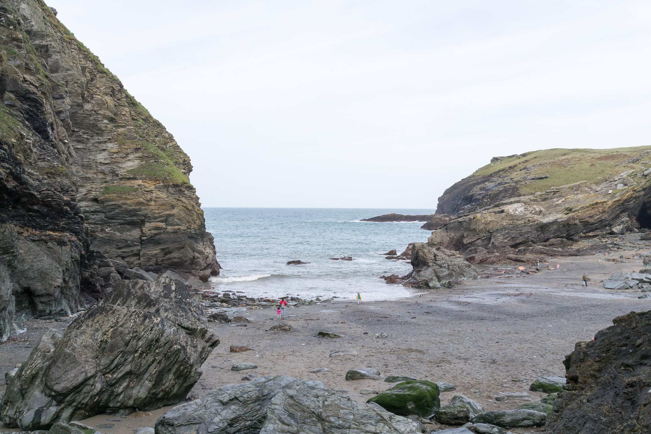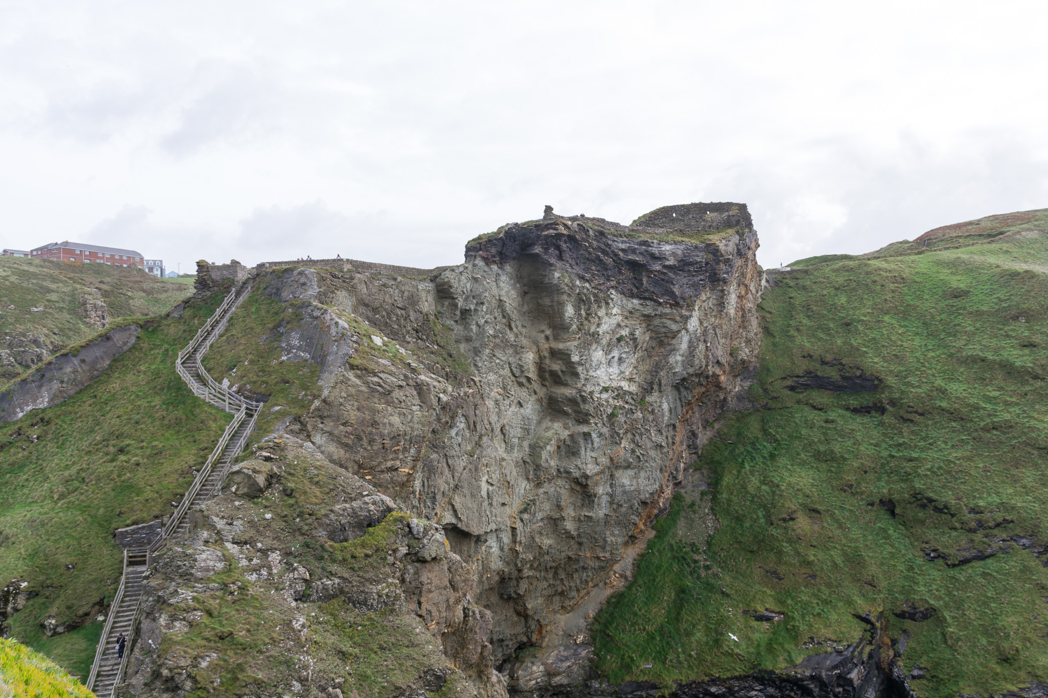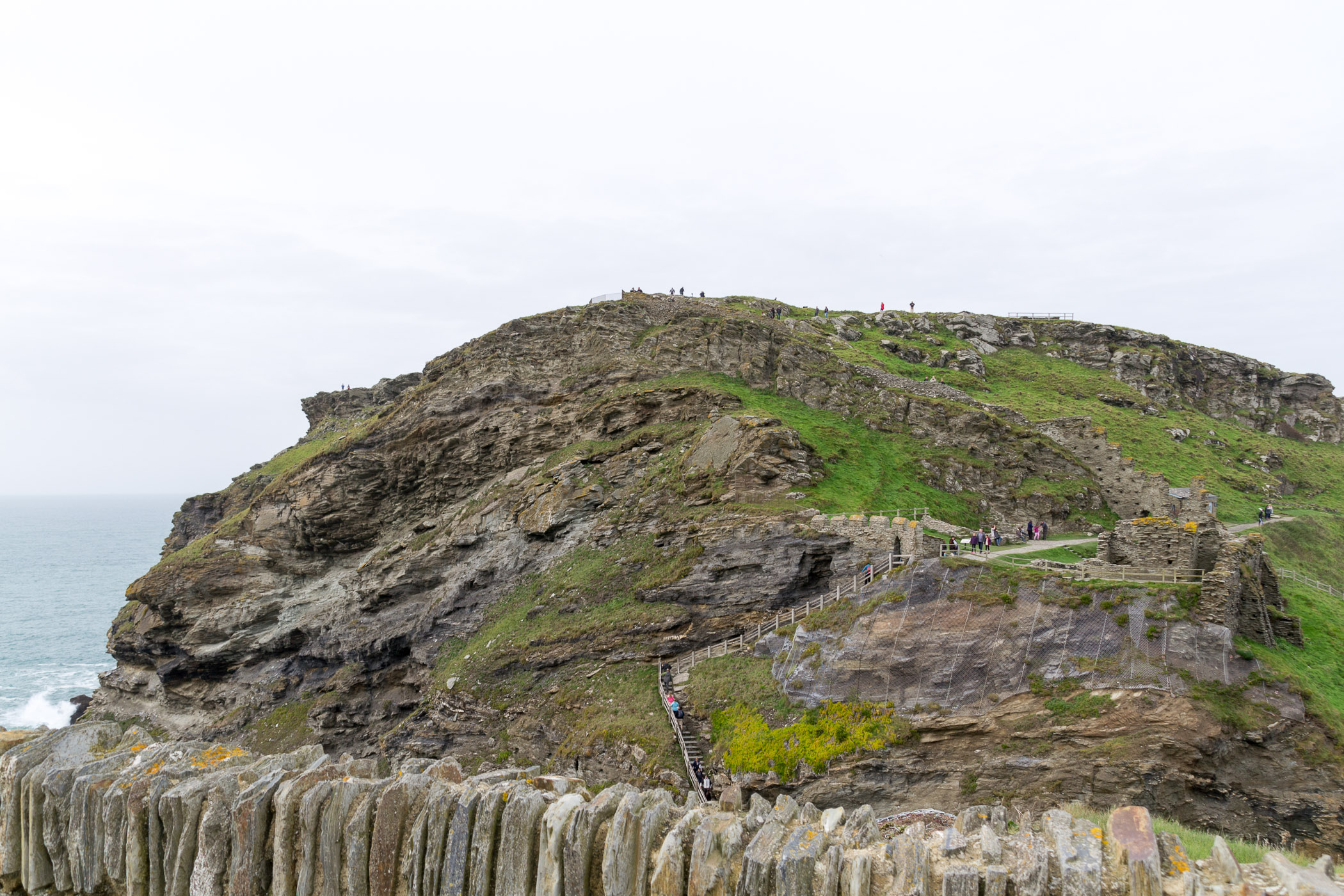 Wir parkten unser Auto also im Dorf Tintagel und machten uns zu Fuß auf den schmalen und sehr steilen Weg runter zur Landzunge wo English Heritage den Eingang und das Museum platzierte. Hier bezahlten wir erst einmal unseren Eintritt. Statt dann gleich auf Tintagel Castle Erkundungstour zu gehen, nutzten wir die Zeit der Ebbe und schauten uns unter der Burg am Strand etwas um. Danach ging es ganz nach oben. Viele unebene Stufen galt es zu erklimmen. Diese waren durch das nasse Wetter auch glatt. So dauerte der Aufstieg etwas und es war auch sehr anstrengend. Oben angekommen wurden wir dann mit einer schönen Aussicht belohnt. Auch die Reste der Burg Tintagel sind bemerkenswert. Wie haben die Leute im Mittelalter all diese Steine hier hoch bekommen? Die Plattform hier oben auf der Halbinsel ist sehr groß und es wurde dort auch Viehhaltung betrieben. Es gibt auf der anderen Seite aber noch eine Kapelle und zu dieser gingen wir anschließend, also wieder runter und wieder hoch, schon waren wir an der Tintagel Kapelle. Nachdem wir genug von den Steinen hatten, wanderten wir wieder zurück zum Auto. Leider hatten wir dort unsere Getränke vergessen. Wir waren schon sehr angestrengt als wir am Auto ankamen und tranken erst einmal unser Wasser, bevor es weiter ging nach The Lost Gardens of Heligan.