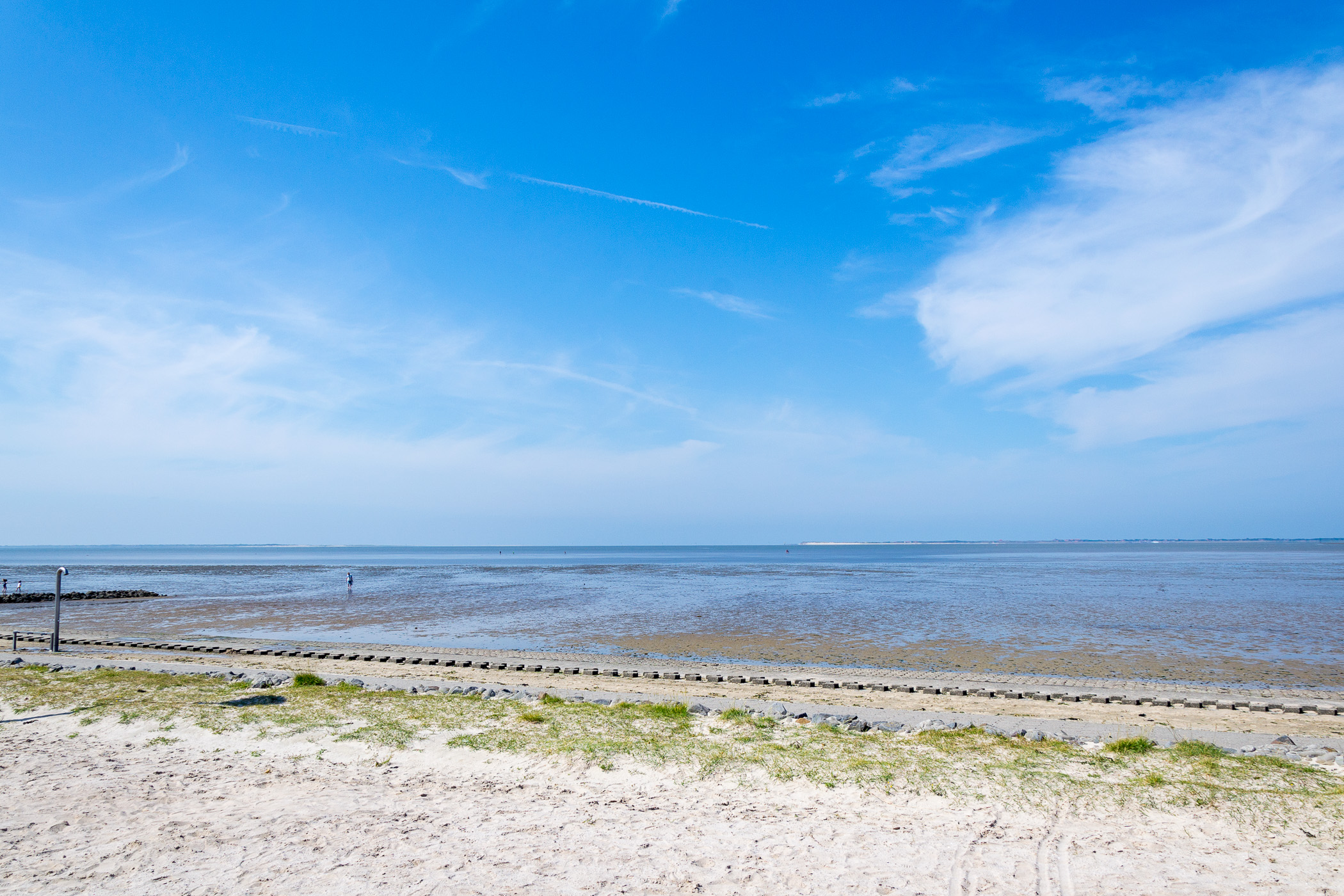 Auch hier finden wir direkt am Strand und Hafen einen Parkplatz. Der Hafen ist wirklich schön. Zwar sehr klein, aber es gibt einige Cafés und Eisdielen direkt am Hafen auf der Seite innerhalb des Deiches. Das ist wirklich schön. Hier laufen wir noch etwas lang. Danach schauen wir am Strand vorbei. Jetzt ist aber Ebbe und das Wasser ist weg. Der Stand ist wie in Harlesiel, also kein Sand direkt am Wasser sondern dort sind Pflastersteine. Das Wasser sahen wir noch, es hatte sich aber sehr zurückgezogen.