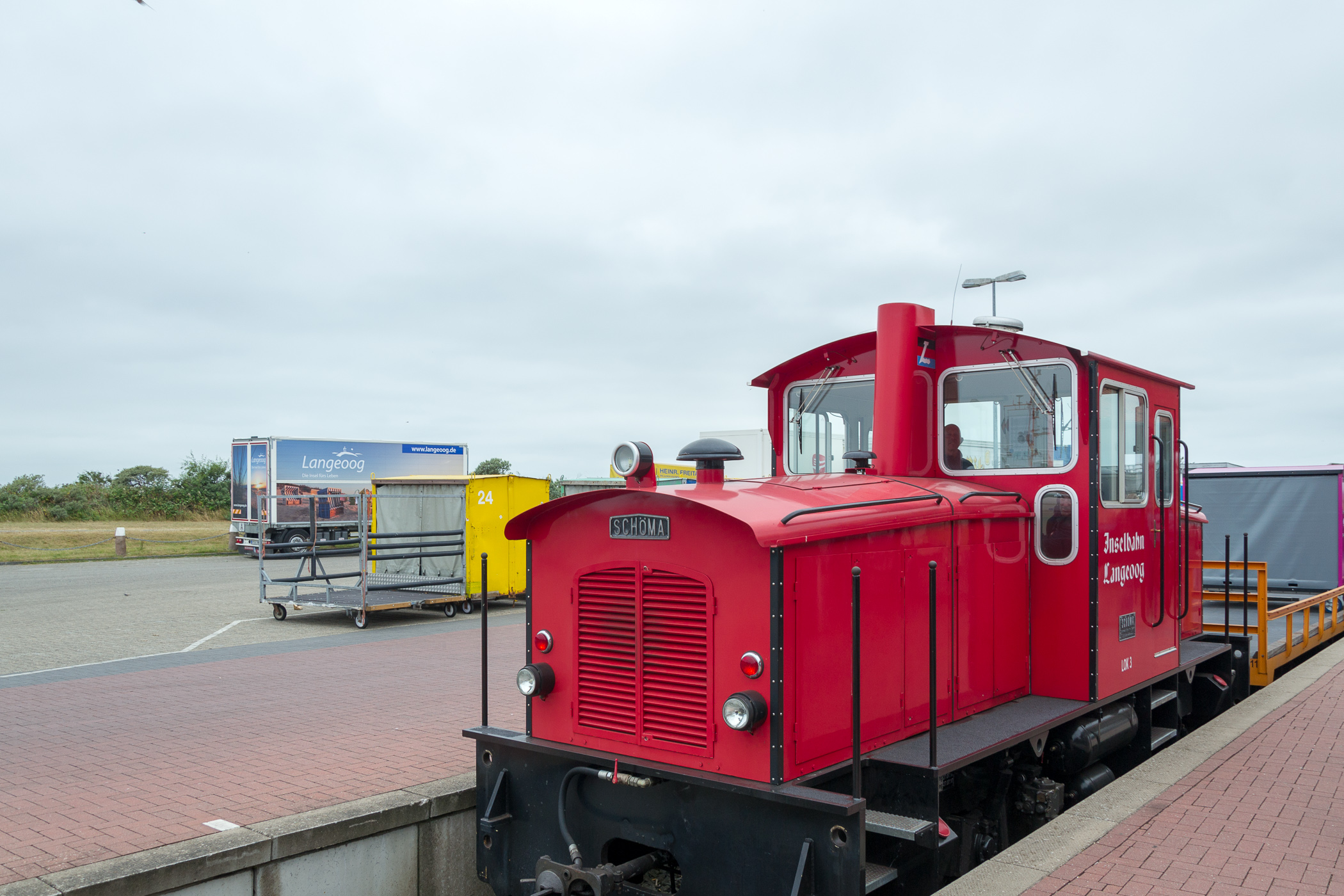 Fast pünktlich kommen wir los. Der Fähranleger ist in Bensersiel. Dort suchten wir uns einen Parkplatz, ein Tag parken kostet 5 €. Dann noch Fährtickets kaufen. Baby und Kinderwagen sind frei, pro Erwachsenem fallen 20 € plus 2,50 € Kurtaxe an. Dann ging es auch schon auf das Schiff. In 35 Minuten brachte uns das Schiff nach Langeoog. Am Fähranleger auf Langeoog steht auch schon die Inselbahn bereit. Diese ist im Fahrpreis inbegriffen. Die Schmalspurbahn bringt uns dann direkt ins Zentrum.