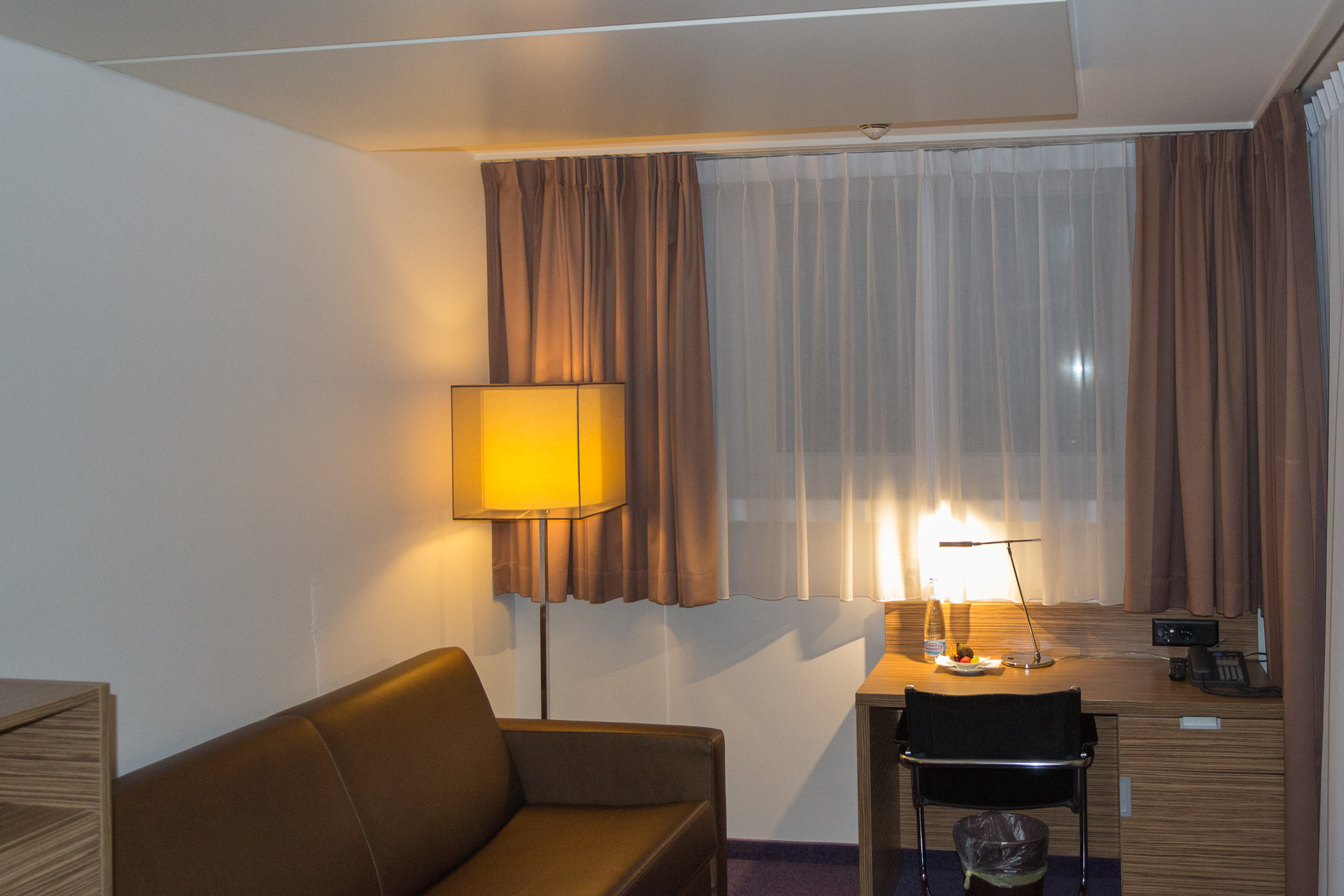 Zum Zimmer gelangten wir mit einem Aufzug, es gibt aber auch ein Treppenhaus. Im Zimmer fanden wir ein modernes Bad mit einem kleinen Fernseher. Im Schlafzimmer stand eine Couch, ein Schreibtisch, ein Bett und ein 32″ Flachbild Fernseher. Dazu fanden wir im Zimmer auch eine Bosch Tassimo Kaffee Maschine und frisches Obst vor. Unser Zimmer lag zur Hauptstraße hin im zweiten Stock. Es war aber ausreichend ruhig um gut schlafen zu können. Die Straße war nur ab und an zu hören.