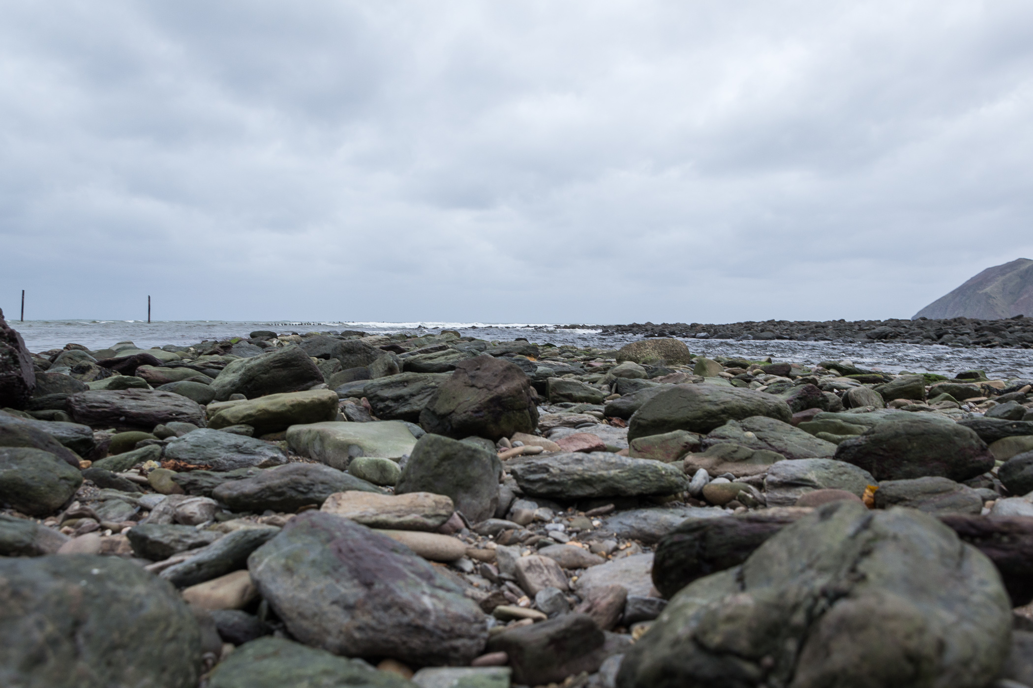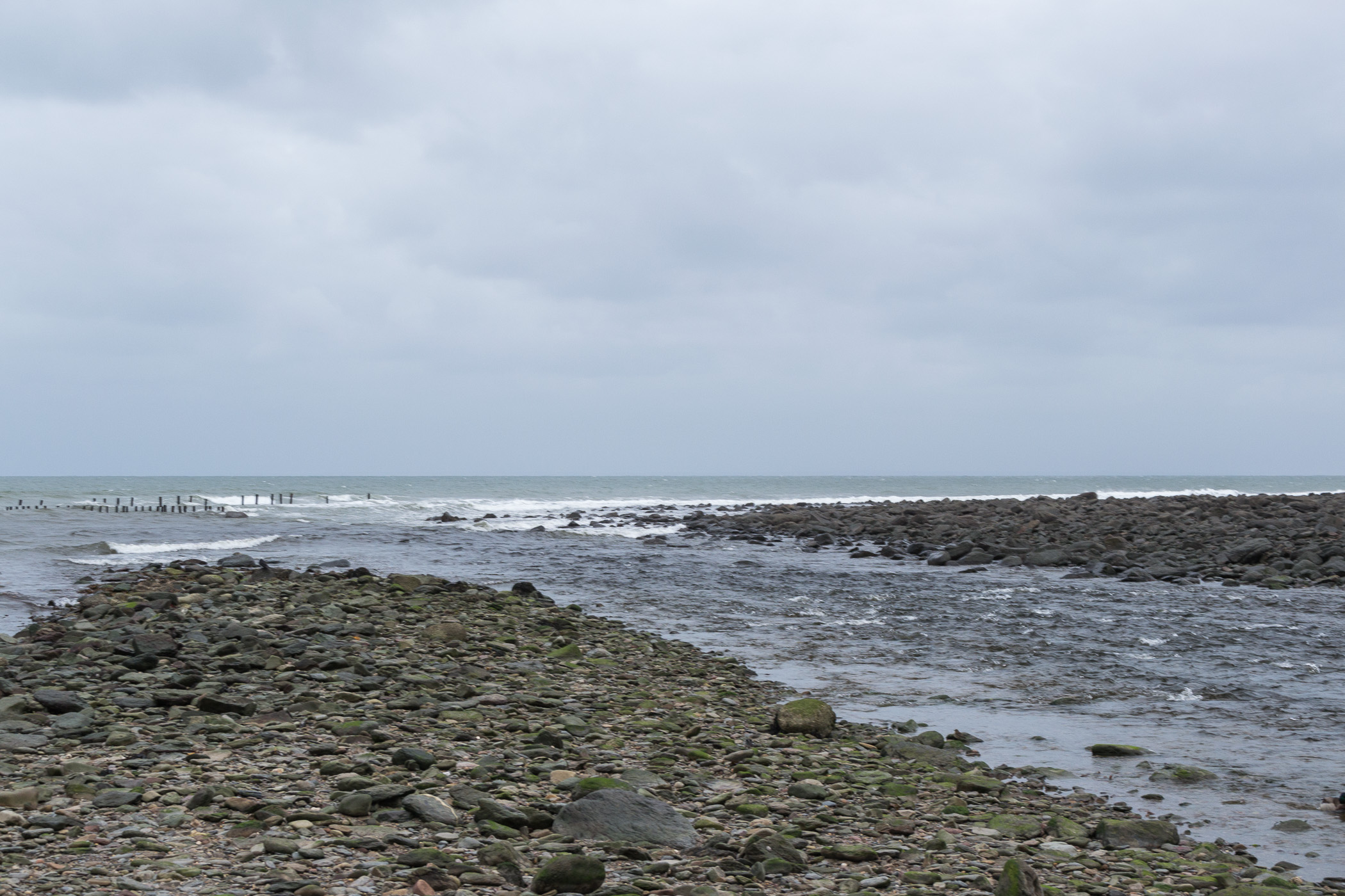 - Blick über die noch trockenen Steinen auf den Bristol Channel