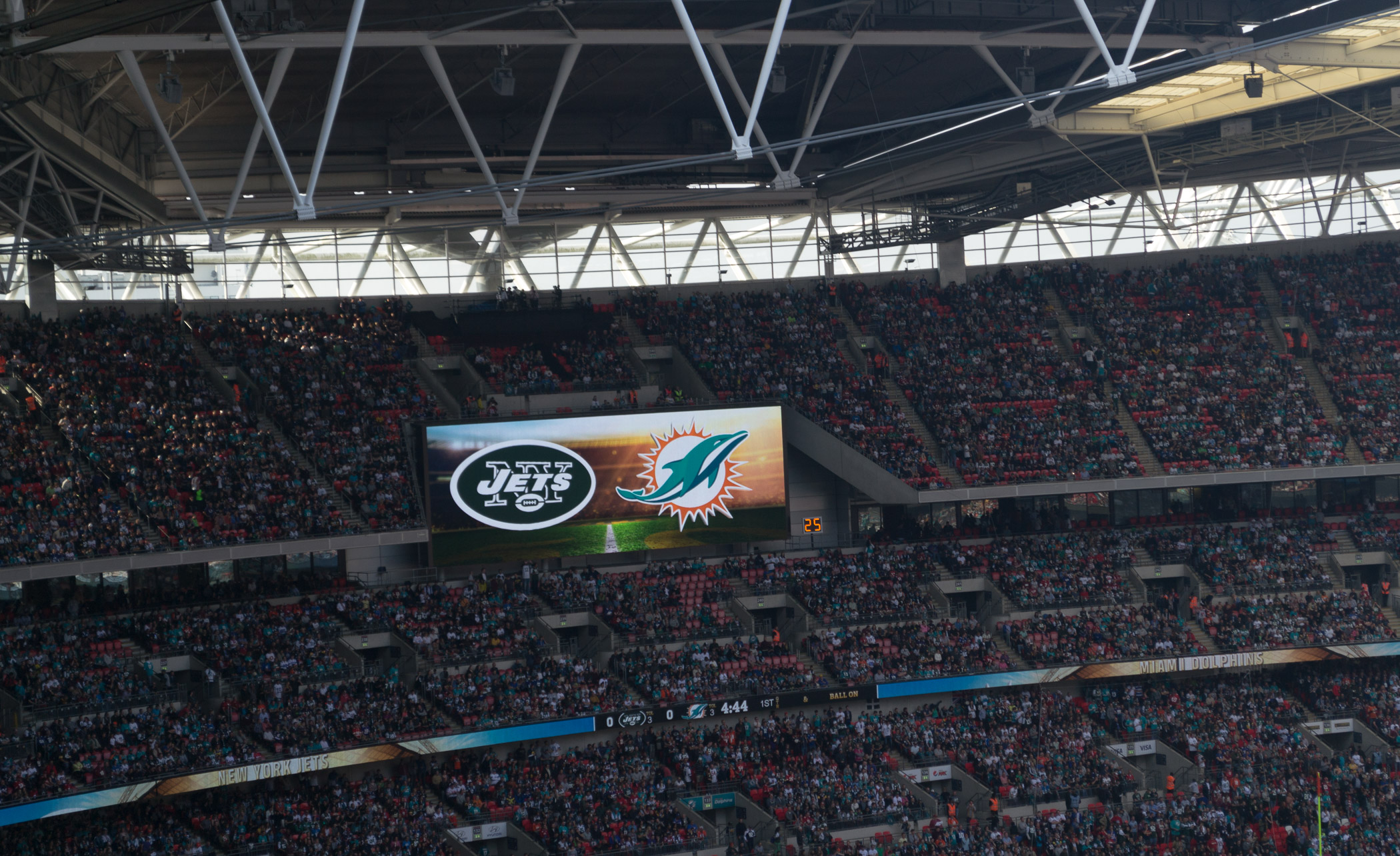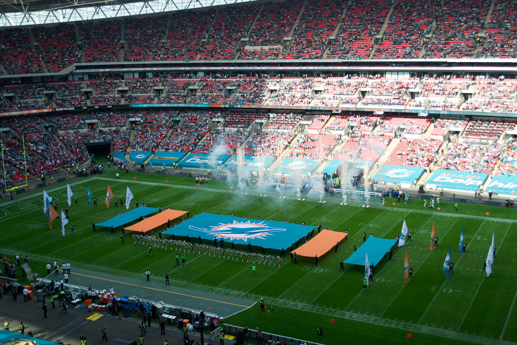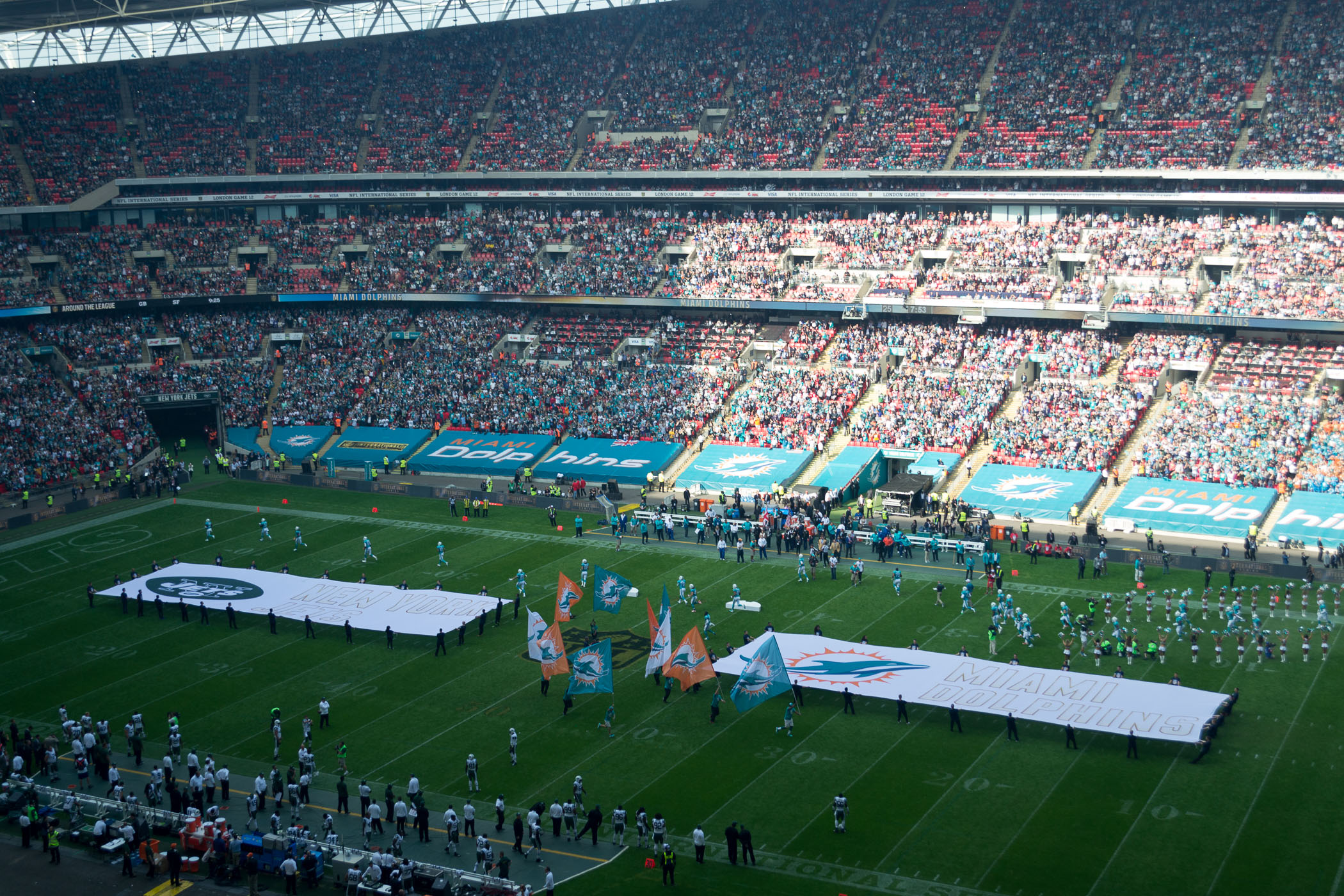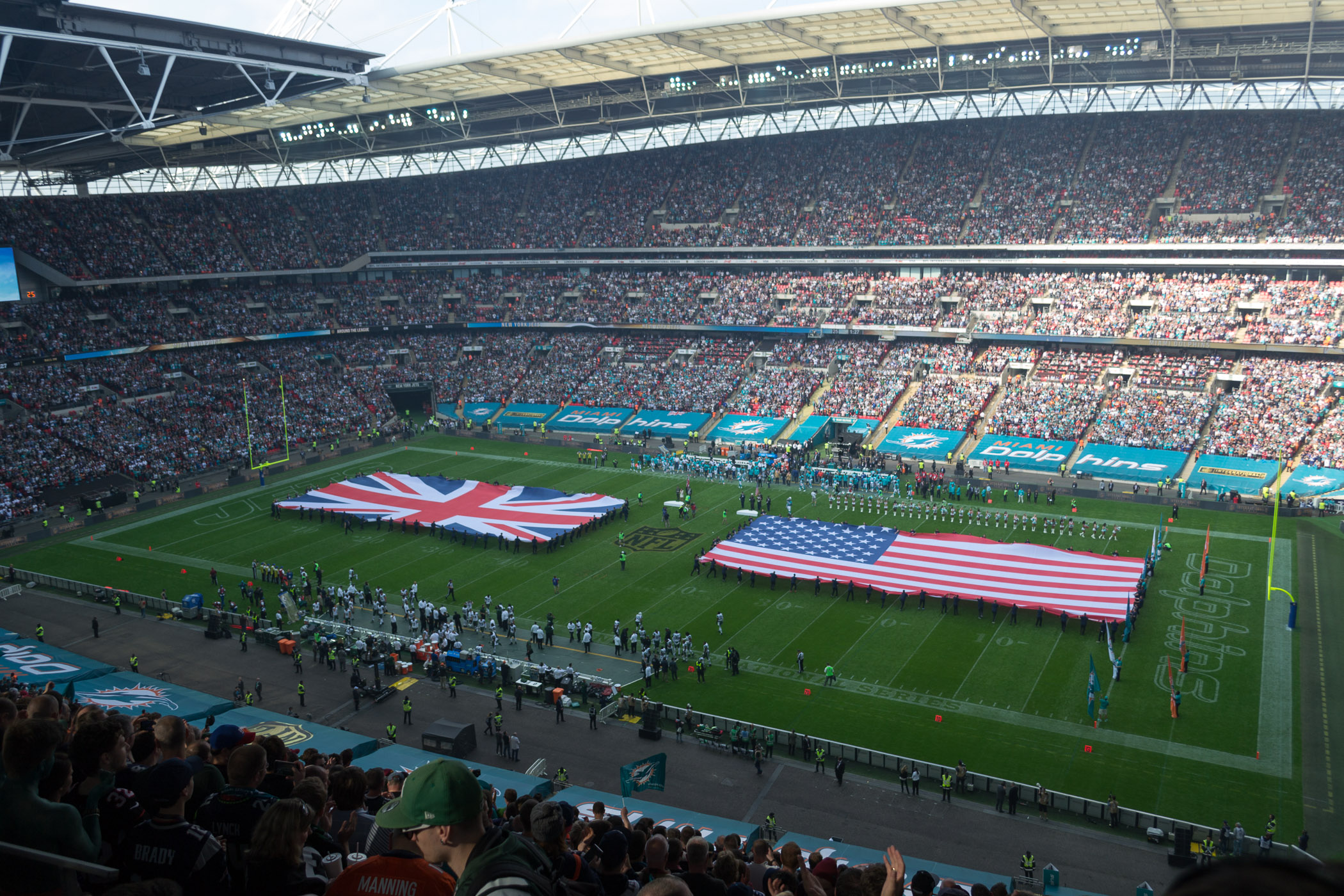 Um 14:30 Uhr war Anstoß zum Spiel Miami Dolphins gegen New York Jets in der NFL. Wir sind 1 Stunde vorher ins Stadion gegangen. Dort gab es noch etwas zu Essen und Trinken, aber untypisch für England, es gab keine Hamburger. Auch waren die Wettbüros im Stadion, wie schon letztes Jahr, geschlossen. Unsere Plätze waren direkt an der Treppe und wir hatten eine gute Sicht über das ganze Spielfeld, auch wenn wir im dritten Rang saßen. Vor dem Spiel durfte die Nationalhymne nicht fehlen. Nachdem die NFL Spieler ihre Einlaufshow zelebrierten, erhob sich das Stadion von Ihren Plätzen. Es wurde zuerst die USA Nationalhymne gesungen und anschließend die britische. Die Atmosphäre erfasste uns direkt wieder wie letztes Jahr und das NFL Spiel in London sollte ja auch gleich los gehen.