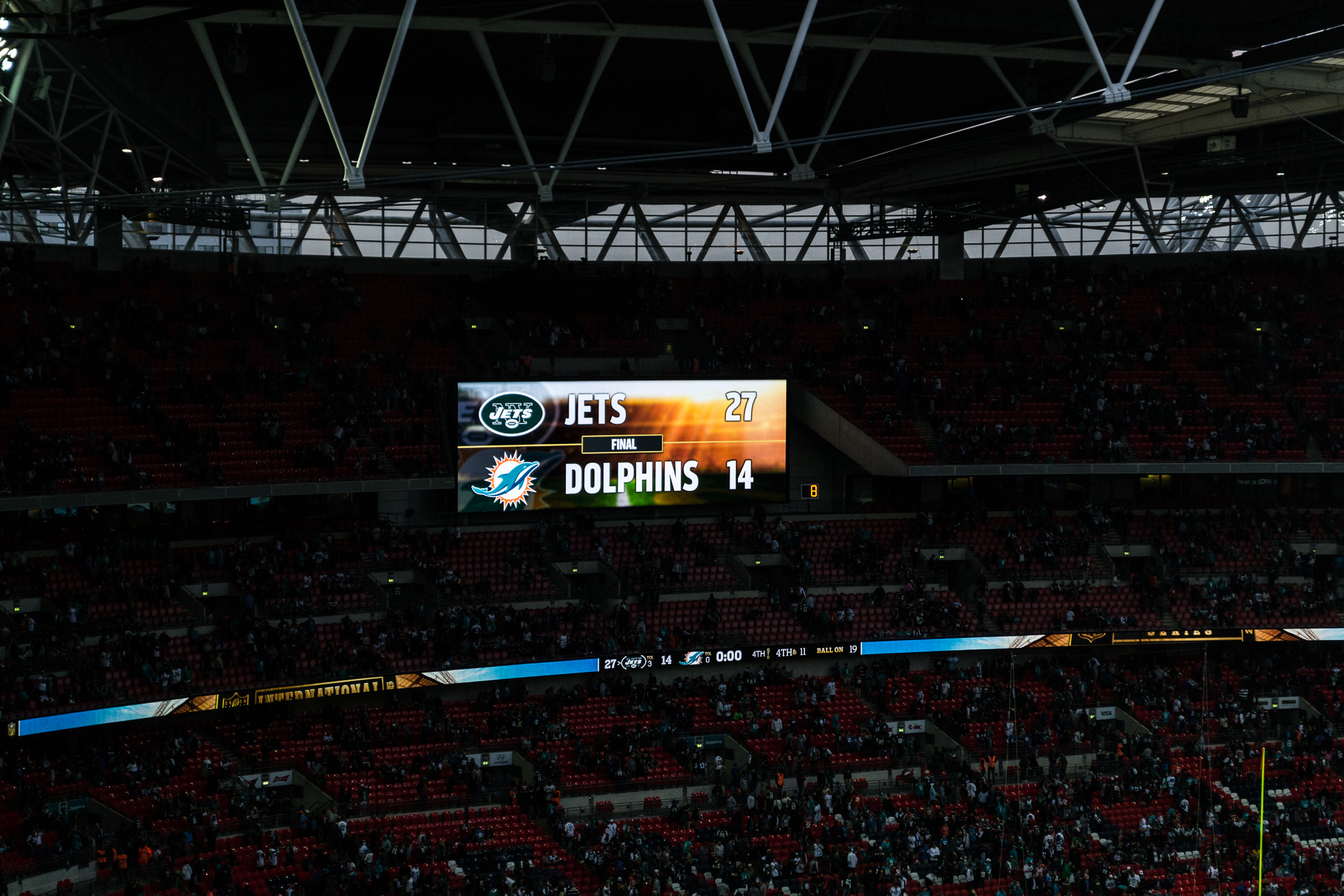 Schon das erste Quarter zeigte, dass die New York Jets heute ein super Spiel abliefern werden, aber die Miami Dolphins dem leider nichts entgegenzusetzen haben. So dümpelte das NFL Spiel in London bis kurz vor Ende des vierten Quarters dahin und von Spannung war nichts zu sehen. Doch zu Ende wurde es dann doch noch einmal spannend, als Miami wie aus dem nichts die Chance hatte zurück ins Spiel zu gelangen. Leider gab es keine Halbzeitshow und auch ist dieses Mal niemand vor dem Spiel aufgetreten. Wir hatten trotzdem sehr viel Spaß bei den sechs Stunden, die wir vor und im Wembley Stadion verbrachten.