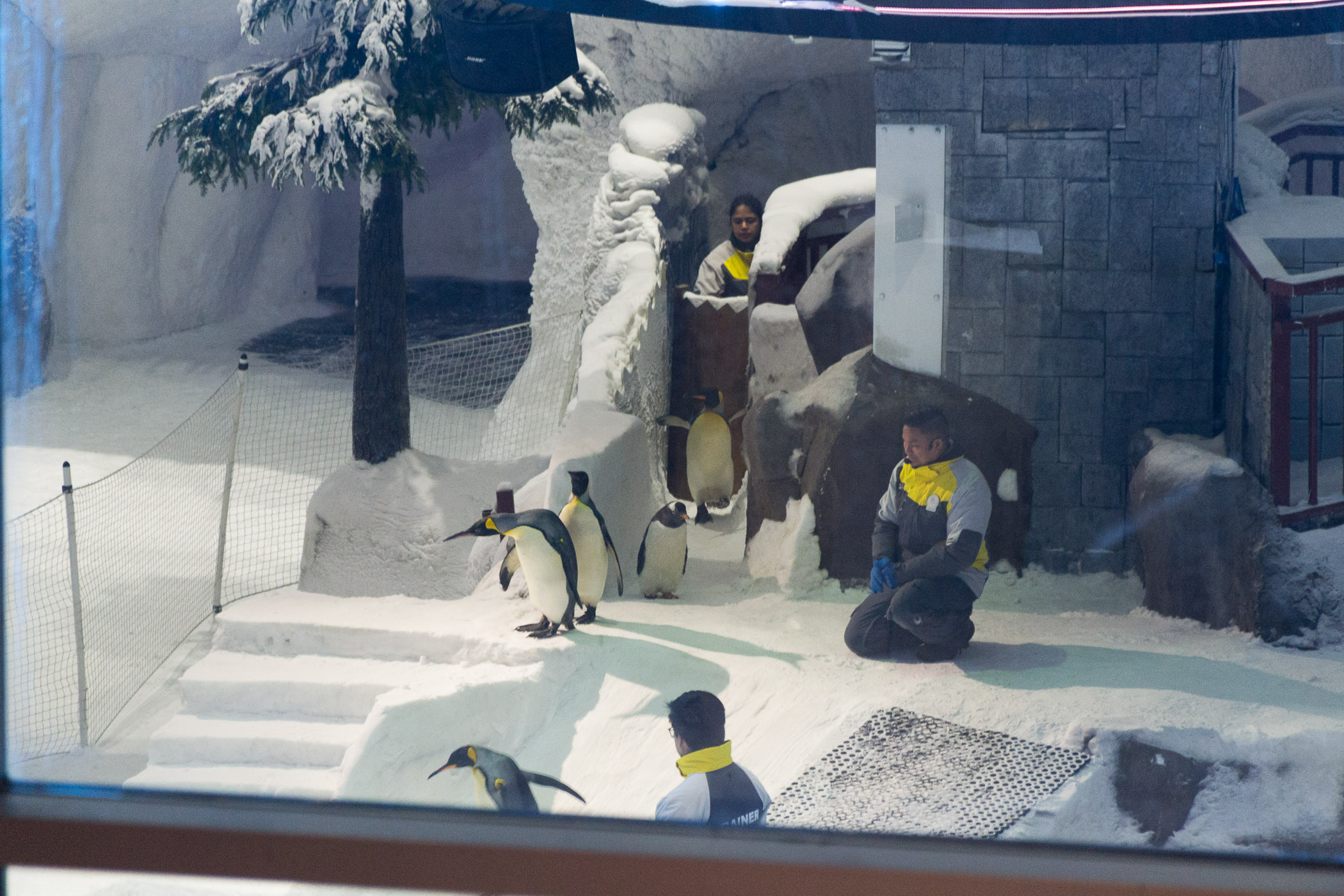 Bei der Emirates Mall stärkten wir uns heute noch etwas, bevor wir wieder auf das Schiff gingen. Doch in der Emirates Mall ließen wir es uns nicht nehmen auch einmal die Skihalle durch die Fenster anzuschauen. Und gerade als wir um 16:00 Uhr dort waren, gab es auch eine kleine Pinguin Show. Es sind aber keine kleinen Pinguine, sondern große Kaiserpinguine.