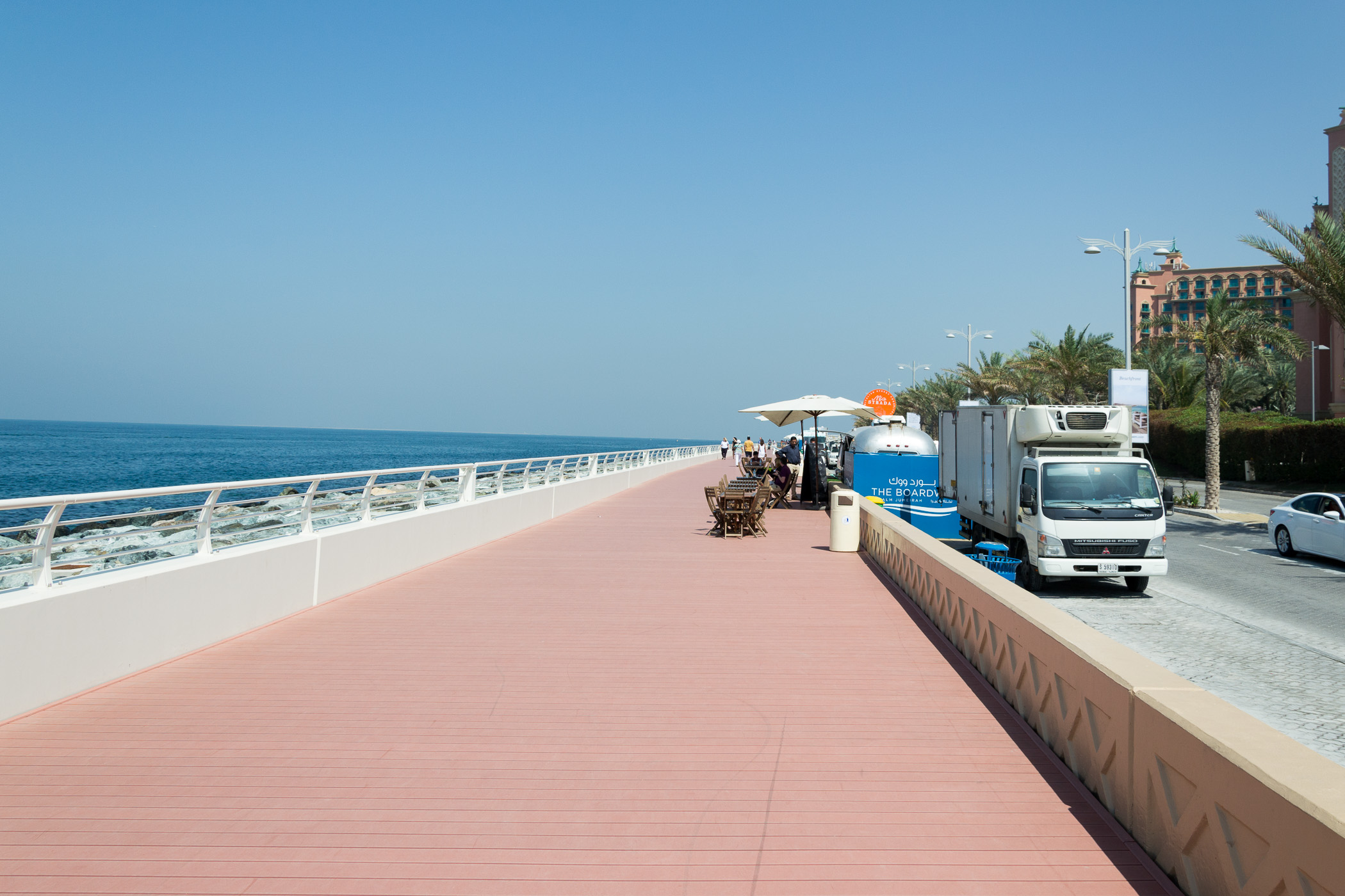 Am Ende angekommen spazierten wir in strahlendem Sonnenschein noch etwas an Dubais Küste entlang. Endlich konnten wir Dubai auch mit Sonne genießen. Viel zu entdecken gibt es hier nicht. Das Hotel ist aber sehr schön und es gibt auch einen Wasserpark. Wir fuhren aber wieder mit der Monorail zurück. Weiter ging es dann mit der Tram zur Dubai Marina. Von der Monorail geht es zu Fuß durch ein Parkhaus bis zur Tramstation.