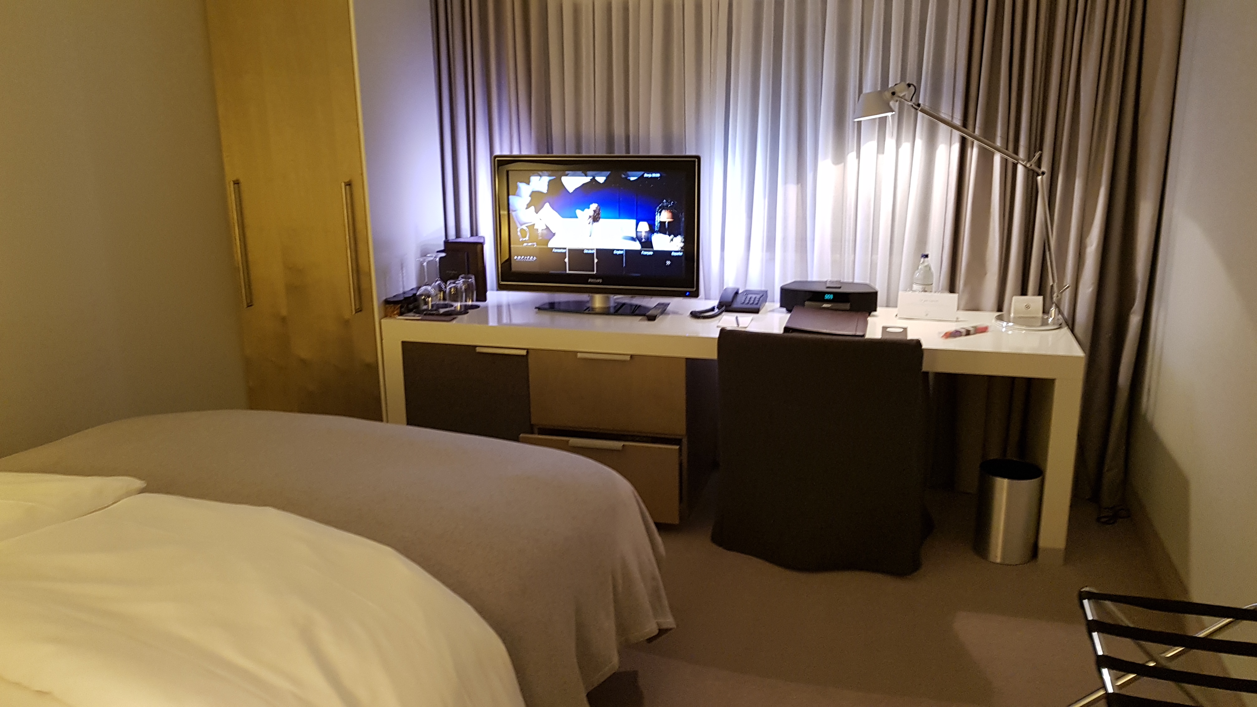Abends, als wir zurück ins Hotel kamen, bekamen wir das Gepäck schnell ausgehändigt. Da wir beim Check-In unsere Zimmerkarte noch nicht bekommen hatten, wurde uns diese jetzt ausgehändigt. Zum Zimmer fuhren wir mit einem gläsernen Aufzug. Die Nummerierung ist etwas ungewohnt. Die erste Ziffer zeigt nicht an in welcher Etage das Zimmer ist. Trotz des Aufzuges mussten wir noch drei Stufen zu Fuß gehen, das ist vielleicht für Gehbehinderte etwas ungünstig. Das Zimmer im Sofitel Hamburg Alter Wall war überraschend klein. Das Zimmer war aber hell und sauber. Im Zimmer stand ein Bett, Schreibtisch mit TV und ein Schrank. Leider konnte ich am Schreibtisch nicht eine Steckdose finden. Wie soll man da arbeiten?